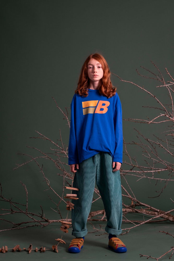 허리 밴딩과 앞뒤 주머니, 장식용 단추가 달린 코듀로이 바지입니다. 앞면 상단에 BMT 자수 장식이 있습니다....