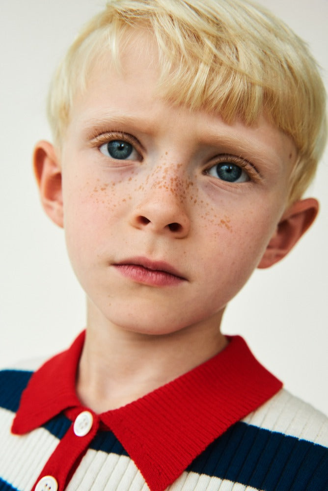 소재: 100% 유기농 코튼와이드한 얀다이드 스트라이프가 돋보이는 립 조직 니트 폴로 셔츠입니다.배색 컬러의 작은 셔츠...