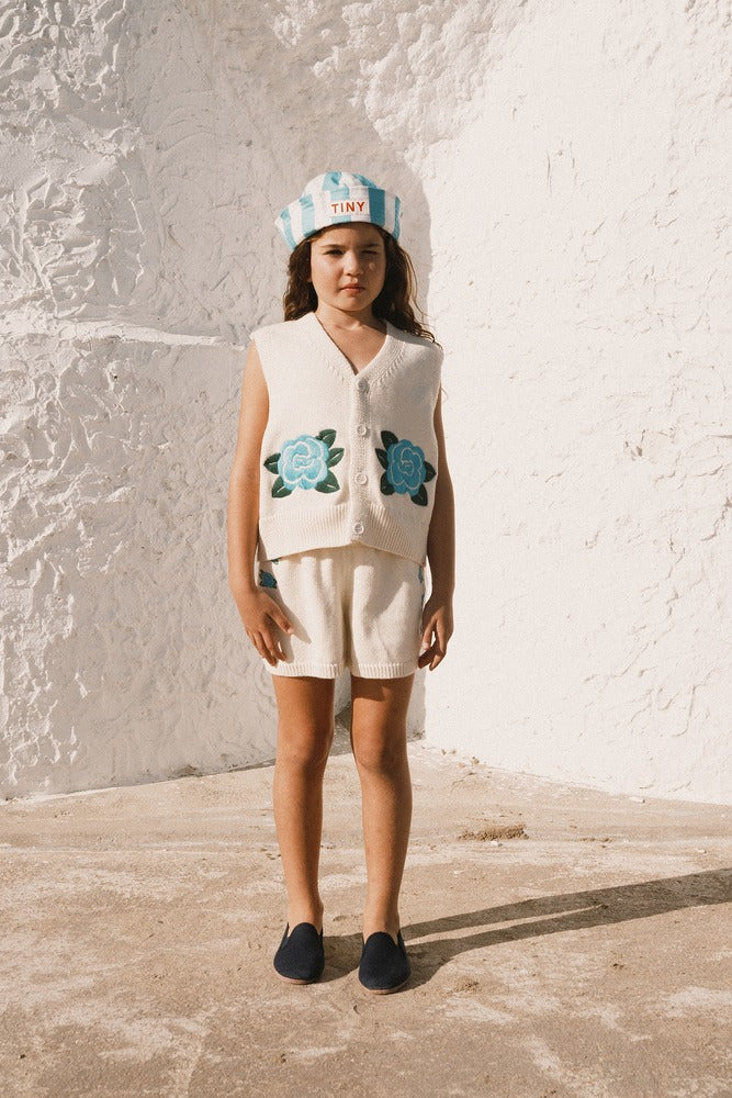 소재: 오가닉 코튼 100%멀티컬러 가디건으로, 브이넥 슬리브리스 디자인에 프론트 버튼 여밈과 텍스처 니트, 자수 디테일을...