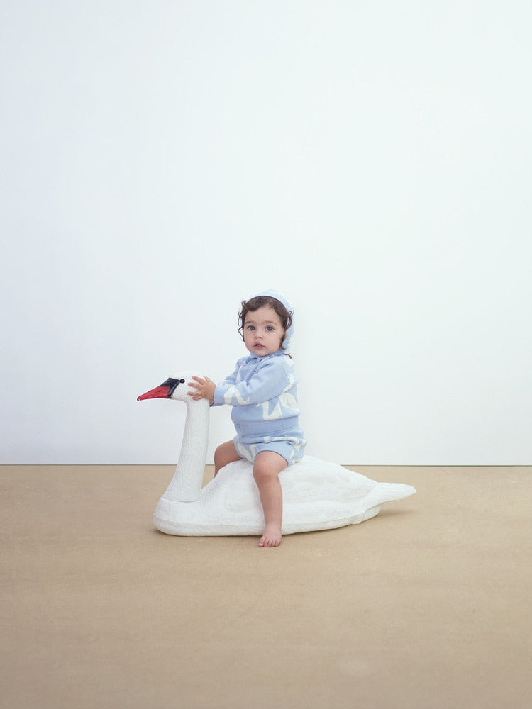 소재: 코튼 100%워시드 블루 컬러 바탕에 빅 스완 자카드 패턴을 더한 베이비 니트 가디건으로, 부드러운...