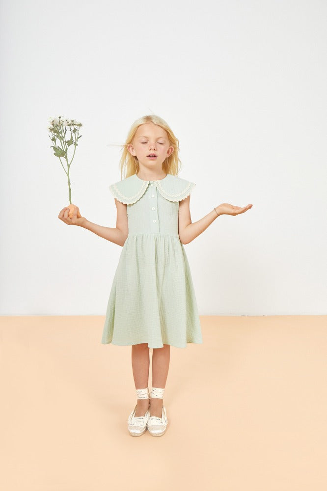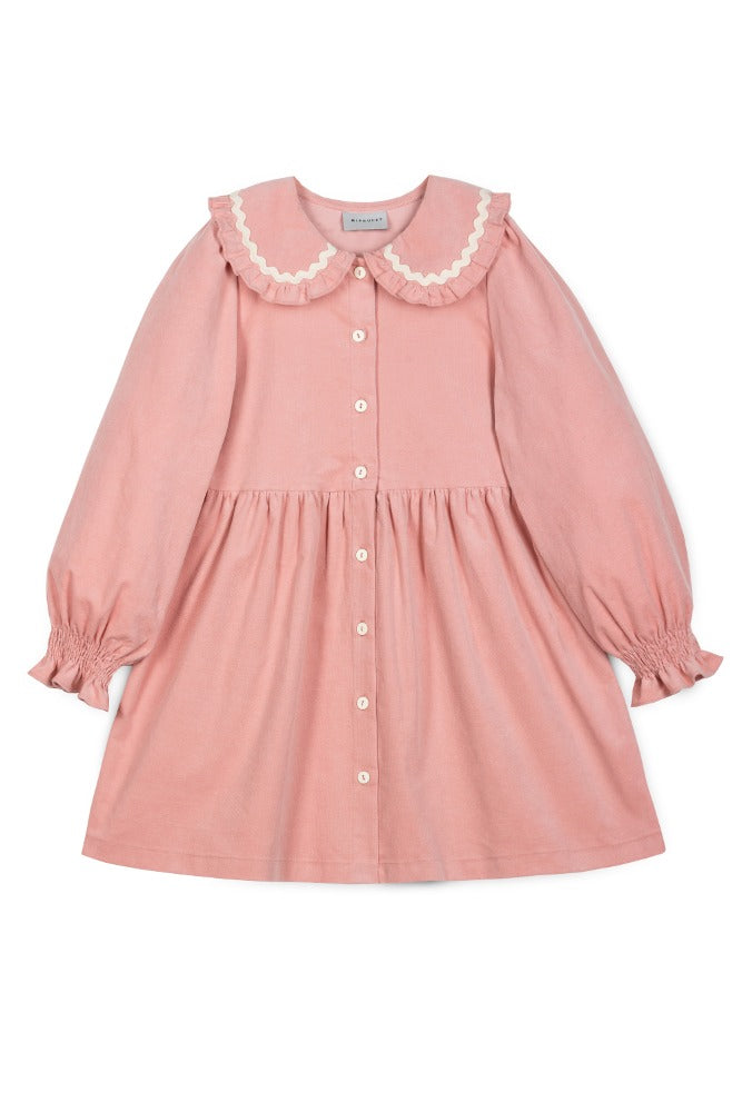 면 소재로 제작된 드레스입니다. 카라 부분에 물결 모양의 테두리가 있고, 카라는 드레스와 대비되는 색상으로 디자인되었습니다....