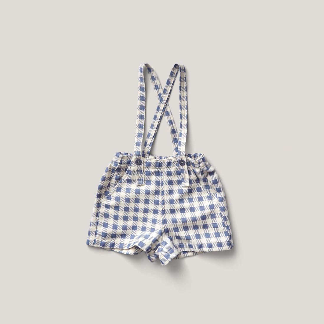 Pull on sailor shorts with braces. Corozo nut buttons, pockets at side and single patch pocket at...