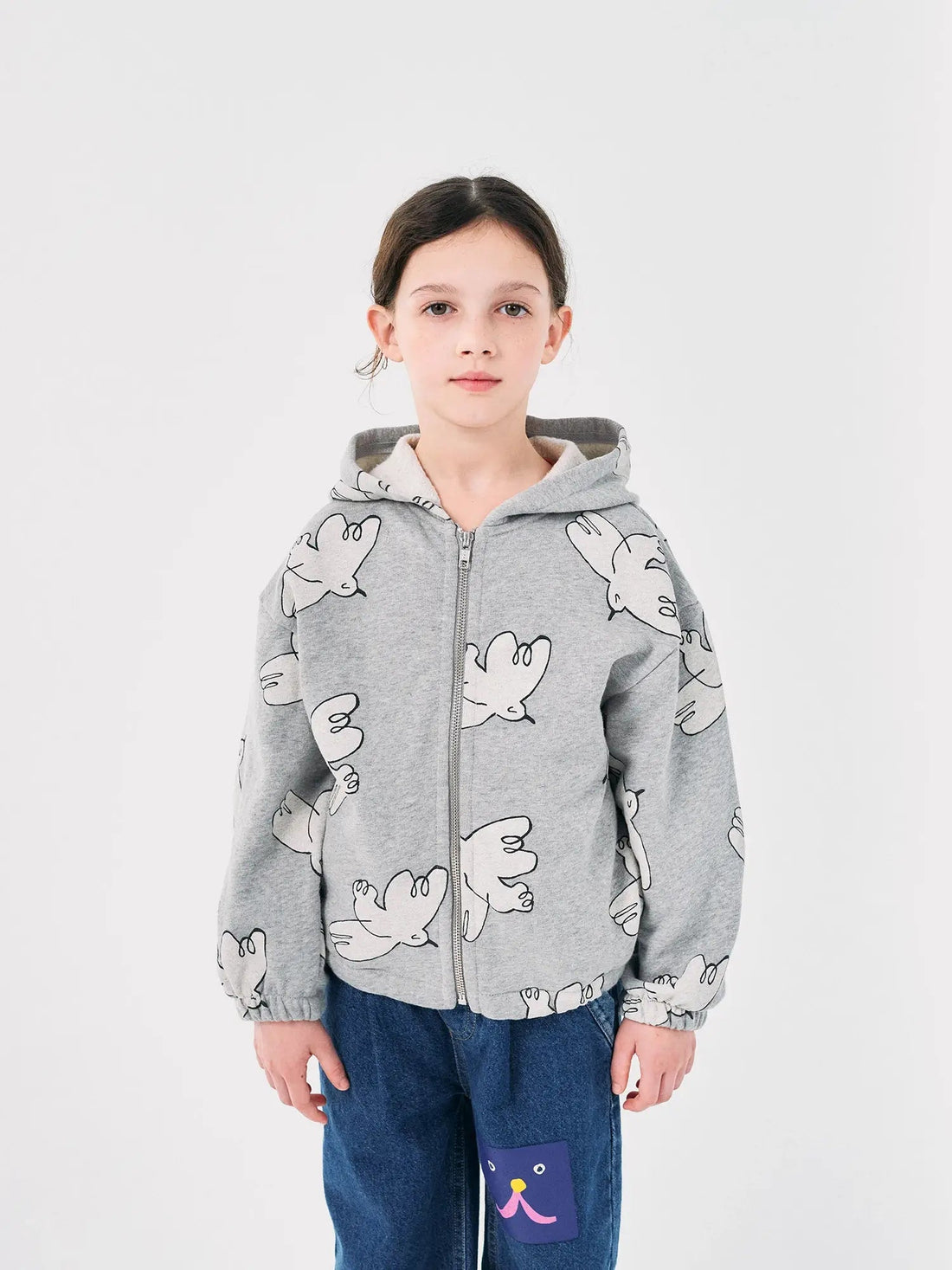 이 그레이 색상의 집업 후디로 아이들의 창의적인 감성을 마음껏 풀어놓으세요. 패턴을 가로질러 날아다니는 새들로 장식된...