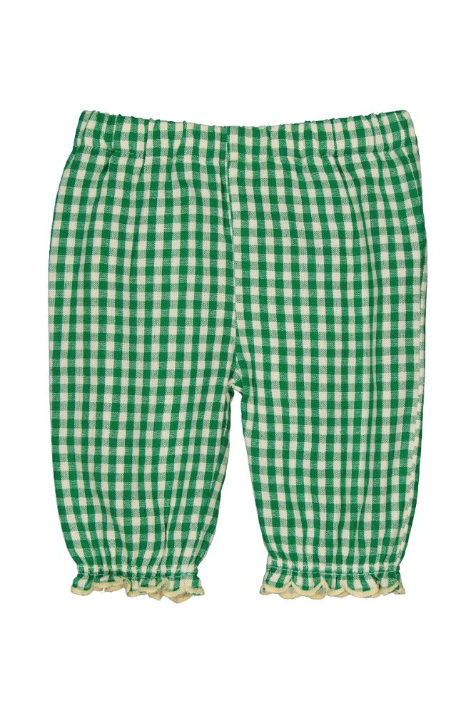 면 소재로 제작된 베이비 팬츠입니다. 밑단에 러플이 있으며, 허리는 밴딩 처리 되었습니다. Made in India.