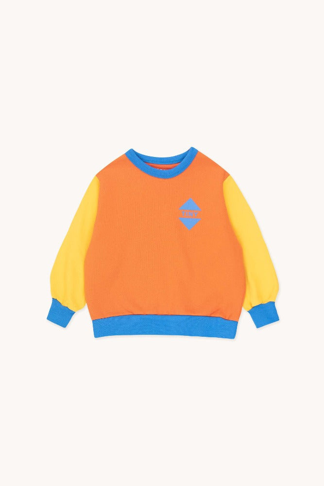 이 브릭 컬러와 딥 옐로우 색상의 컬러 블록 스웻셔츠는 100% 면으로 제작되었습니다. 라운드 넥라인과 신축성...