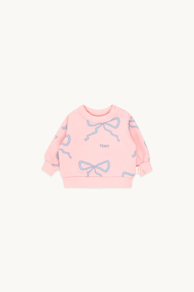 이 피치 베이비 스웻셔츠는 전체에 리본 프린트가 있으며, 95% 면과 5% 엘라스테인으로 제작되었습니다. 라운드 넥과...