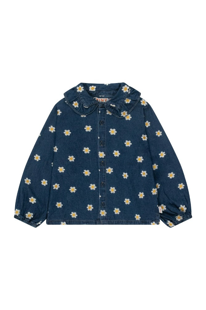 이 다크 워시 데님 블라우스는 전체적으로 데이지 자수가 새겨져 있으며, 100% 면으로 제작되었습니다. 버튼다운 프론트와...