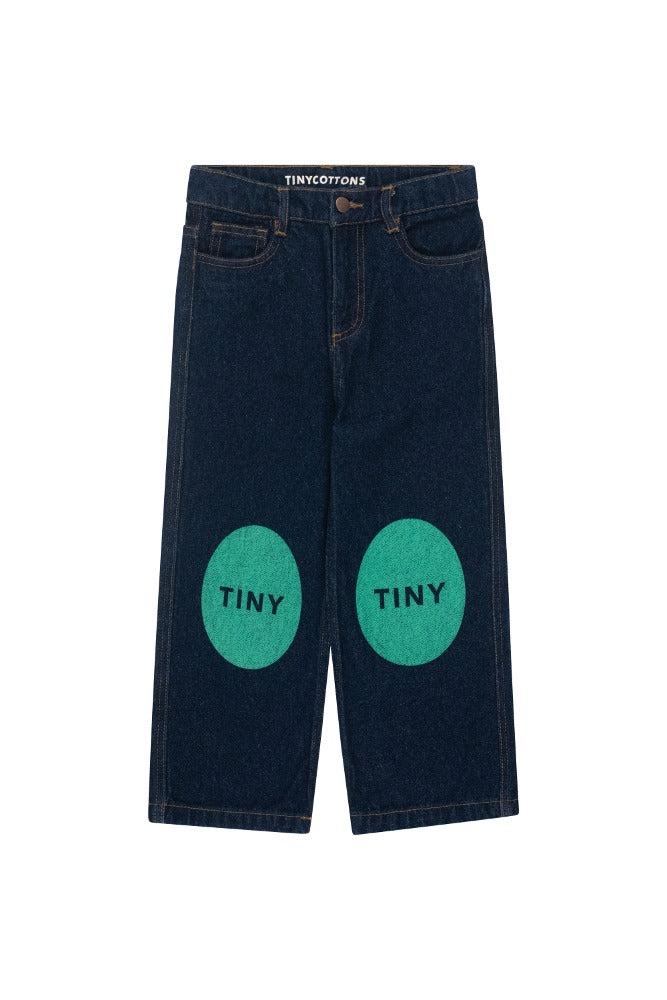 이 클래식 다크 워시 데님 진은 무릎 부분에 그린 프린트 패치가 있으며, 100% 면으로 제작되었습니다....
