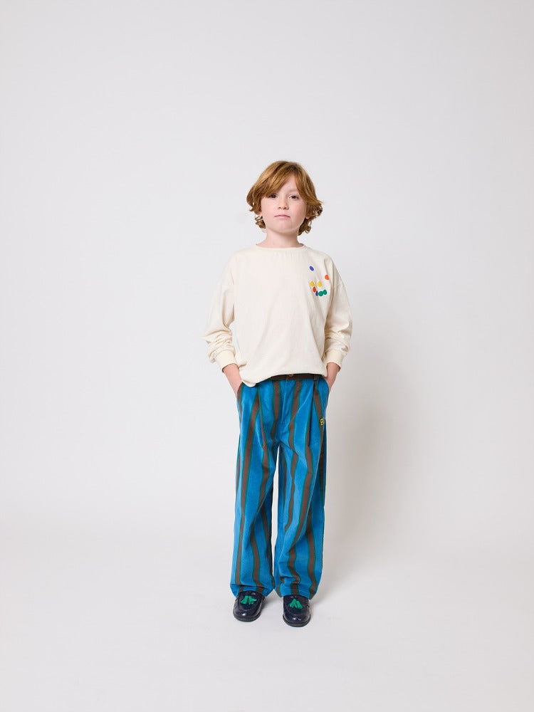 허리 밴딩과 앞뒤 패치 포켓이 달린 바지. 넓은 세로 줄무늬 디자인입니다. 100% 오가닉 코튼 플리스....
