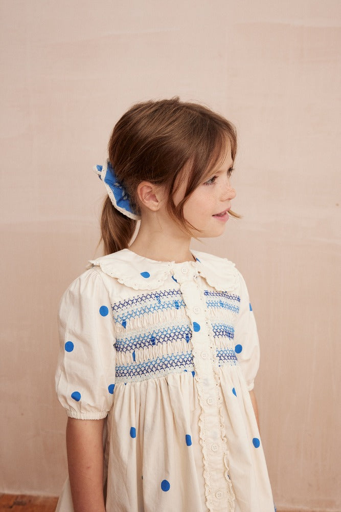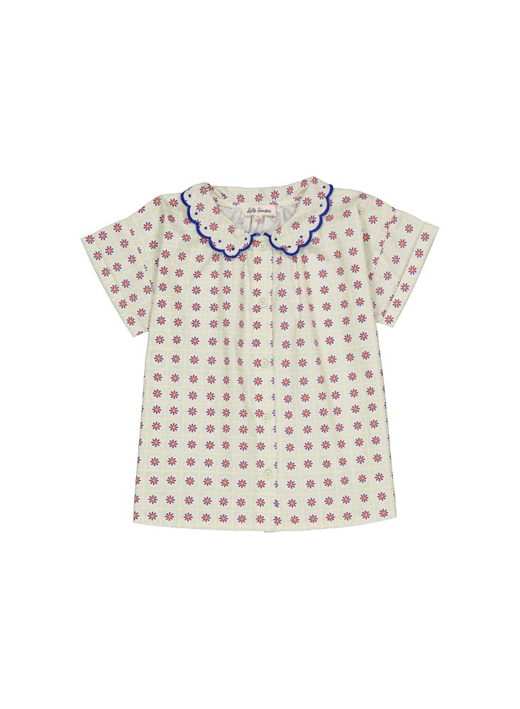 소재: 면프린트 거즈 소재로 제작된 플레어 실루엣의 베이비 블라우스입니다.넓은 화이트 칼라에는 크로셰 스티치 자수를 둘러...
