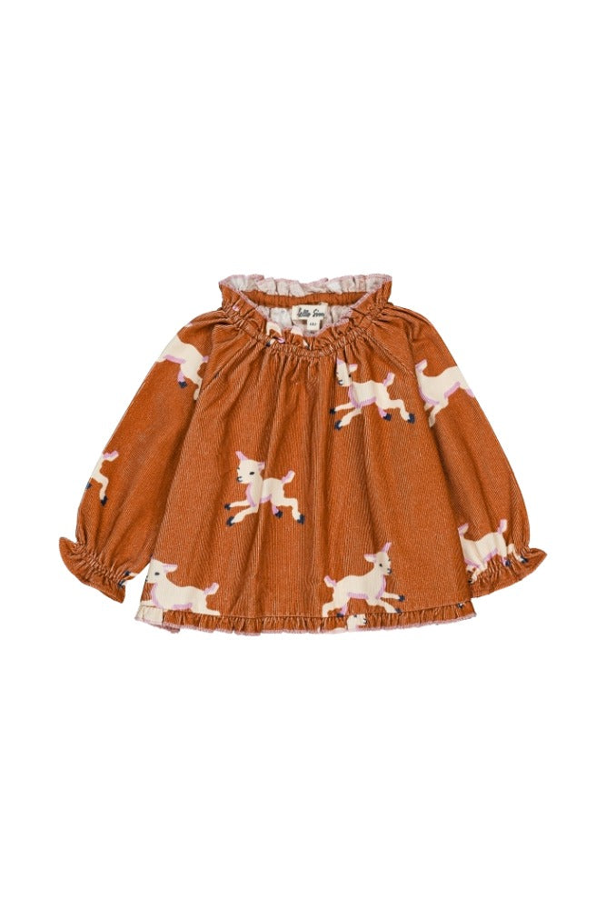 소재: OEKO-TEX 인증 면올오버 프린트된 코듀로이 소재의 베이비 블라우스입니다.칼라와 소매 끝에는 작은 러플과 신축성 있는...