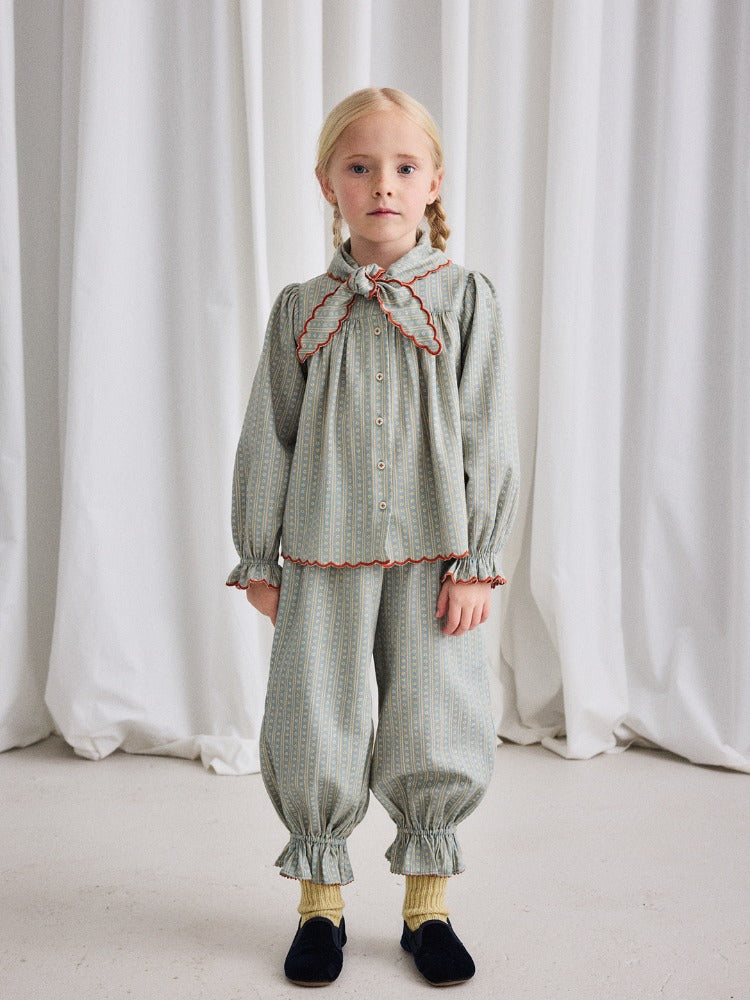 소재: 100% 코튼코튼 트윌 소재의 풀온 팬츠.셔링을 더한 신축성 있는 허리 밴드와 자수 도트 스티치...