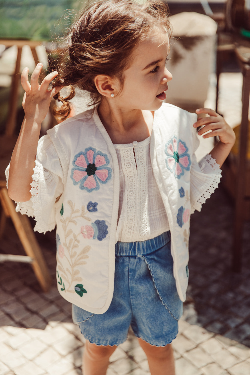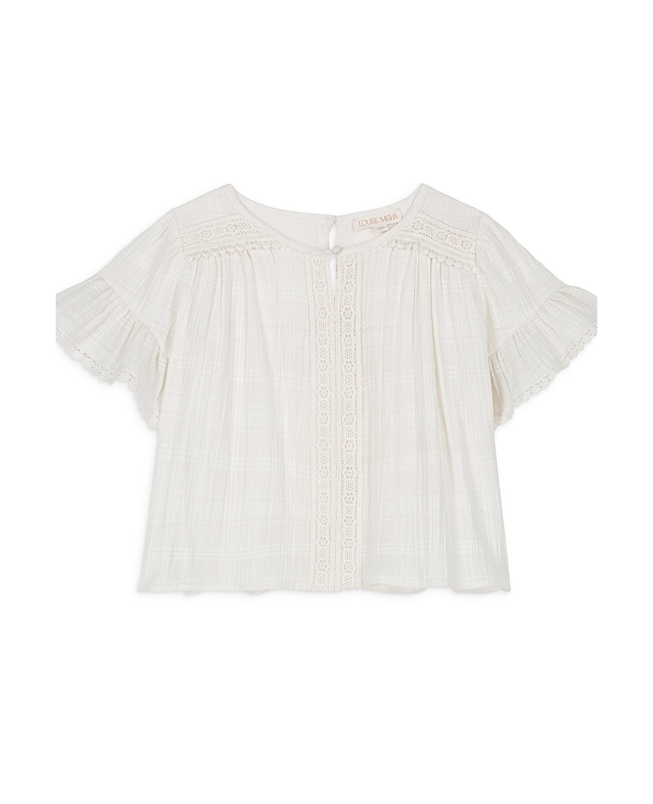 우리가 좋아하는 디테일:· 체크 패턴 효과가 있는 텍스처드 코튼 소재의 솔리드 컬러 블라우스· 앞면 티어드롭 오프닝과 버튼 디테일· 앞면과 상단에서 하단까지 레이스 인레이 디테일· 레이스 엣지가 있는 러플 소매· 뒷면 슬릿 오프닝과 버튼 디테일* 참고: 3세 이하 사이즈는 뒷면 버튼이 전체 오픈형입니다.물 온도 30°C 로 약하게 세탁표백 금지기계건조 금지낮은 온도로 다림질드라이클리닝뒤집어서 세탁화기에 가까지 하지 말 것