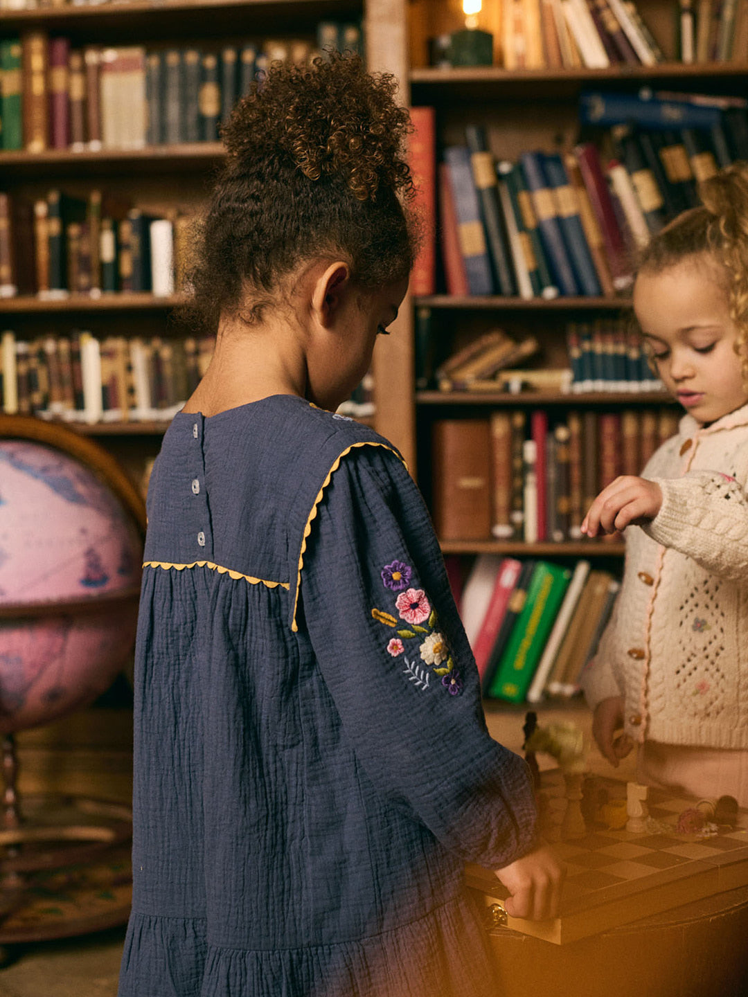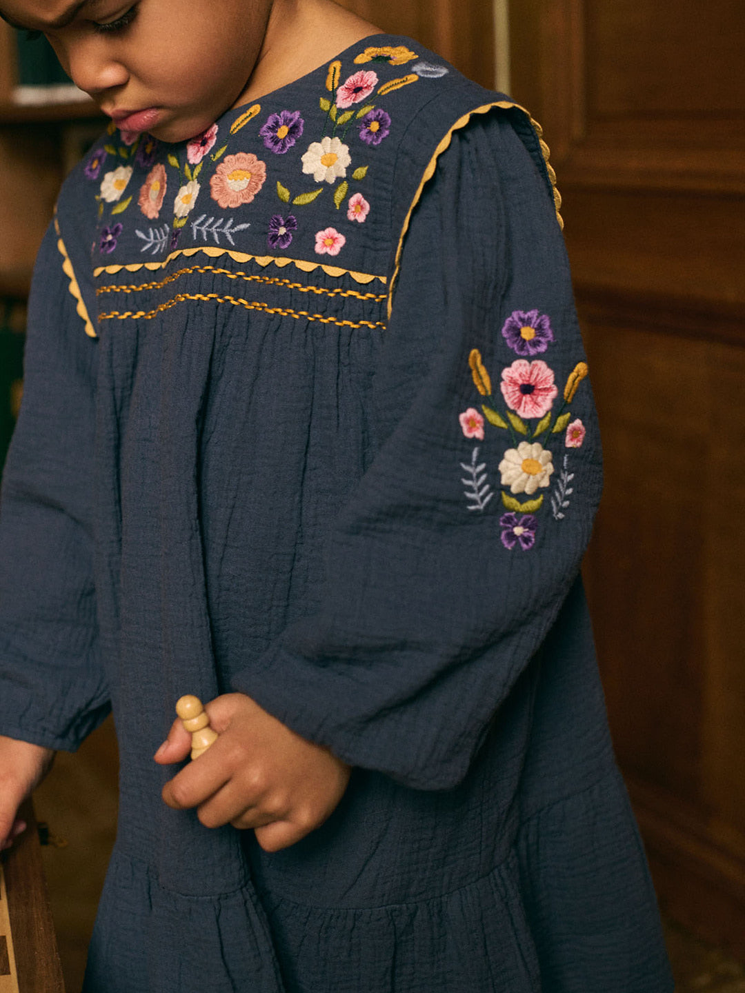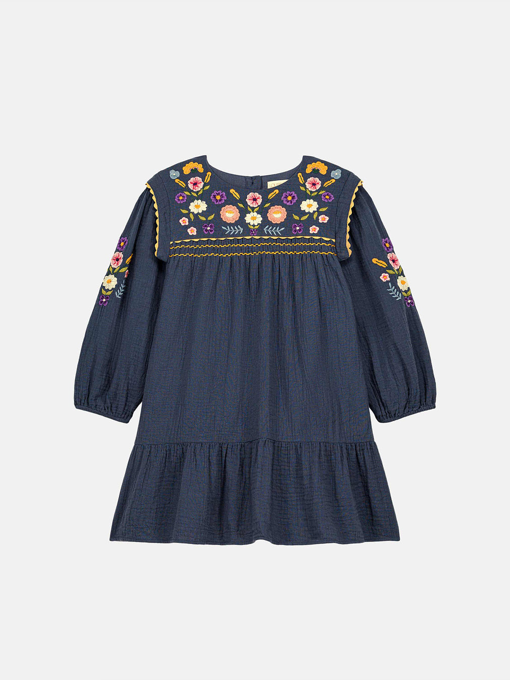 우리가 사랑하는 디테일:· 소재: 100% 오가닉 코튼 우븐 소재· 더블 코튼 거즈 소재의 솔리드 컬러 드레스· 가슴 부분에 컬러풀한 자수와 핸드 스모크 디테일· 릭랙 장식이 더해진 암홀 오버레이 디자인· 컬러풀한 자수와 신축성 있는 소맷단이 더해진 긴 소매· 풍성한 실루엣을 연출하는 밑단 러플 디테일· 뒷면 버튼 여밈· 3세 이하 사이즈는 뒷면 전체 버튼 여밈으로 구성되어 있습니다· 안감 있음이 제품은 마리 피당세(Marie Pidancet)와 그녀의 팀이 파리에서 디자인했습니다.물 온도 30°C 로 약하게 세탁표백 금지기계건조 금지낮은 온도로 다림질드라이클리닝뒤집어서 세탁화기에 가까지 하지 말 것
