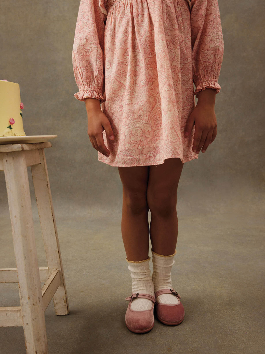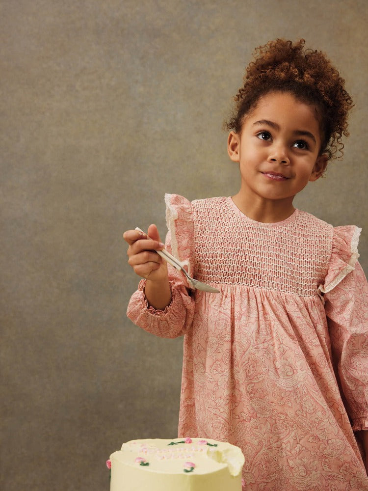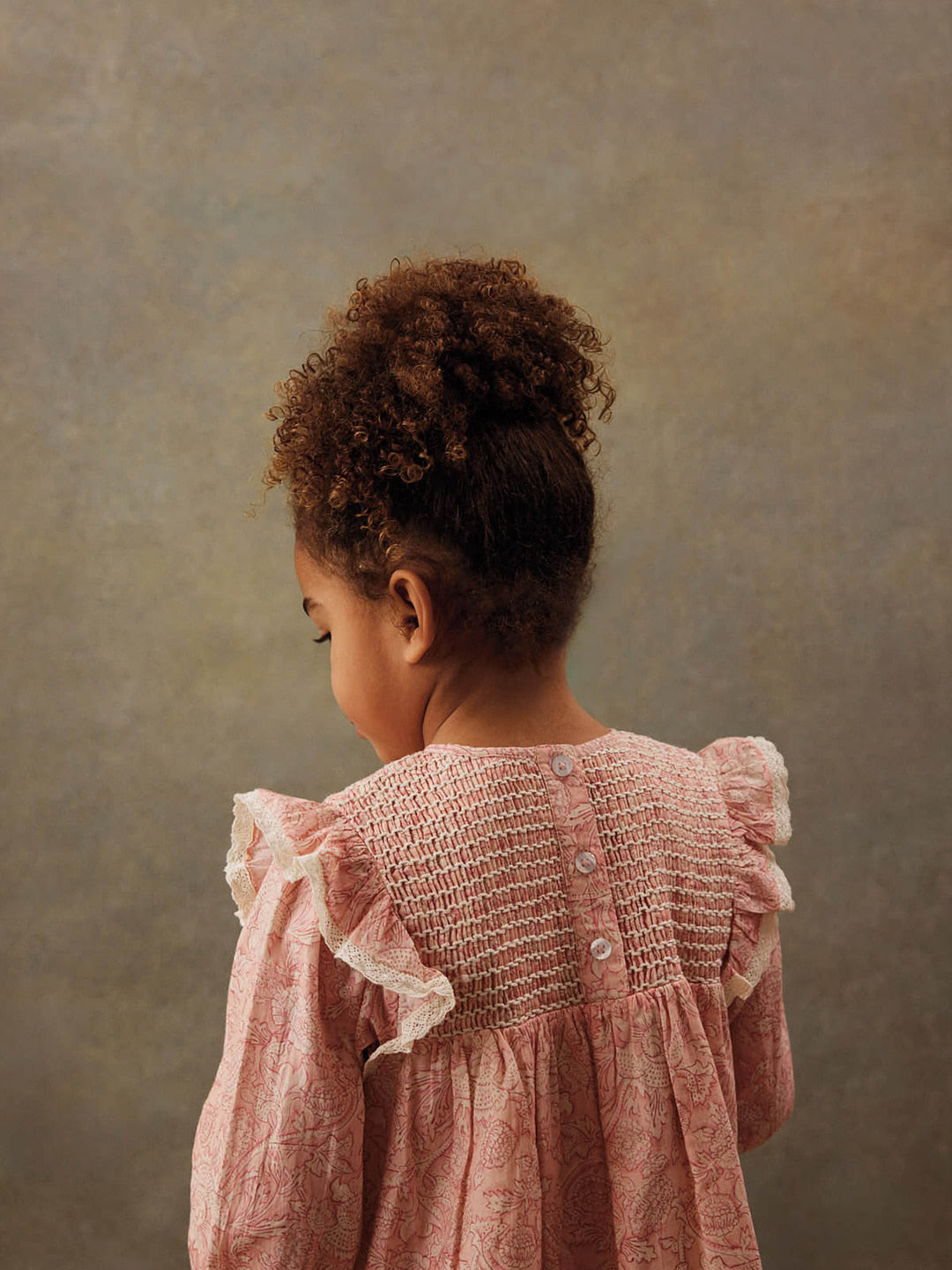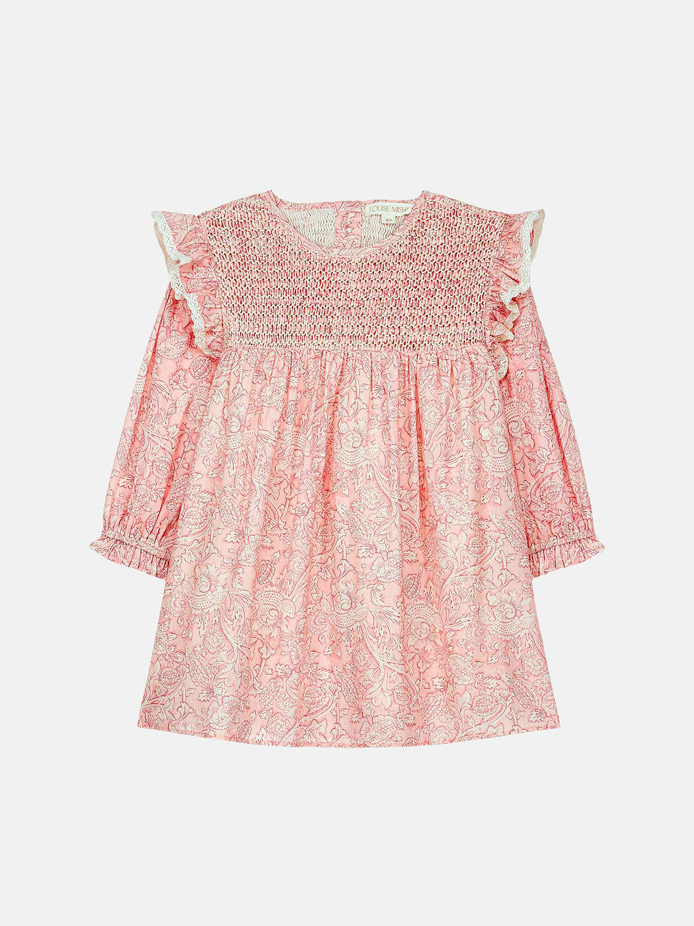 우리가 사랑하는 디테일:· 소재: 100% 오가닉 코튼 우븐 소재· 플로럴 바티스트 코튼 드레스· 핸드 자수 디테일이 더해진 전체 스모크 드레스 상단· 레이스 마감 러플 암홀· 신축성 있는 소맷단과 러플이 있는 긴 소매· 뒷면 버튼 여밈· 3세 이하 사이즈는 뒷면 전체 버튼 여밈으로 구성되어 있습니다· 안감 있음이 제품은 마리 피당세(Marie Pidancet)와 그녀의 팀이 파리에서 디자인했습니다.물 온도 30°C 로 약하게 세탁표백 금지기계건조 금지낮은 온도로 다림질드라이클리닝뒤집어서 세탁화기에 가까지 하지 말 것