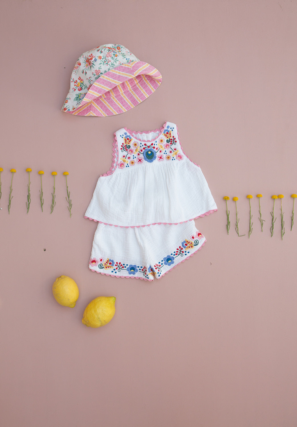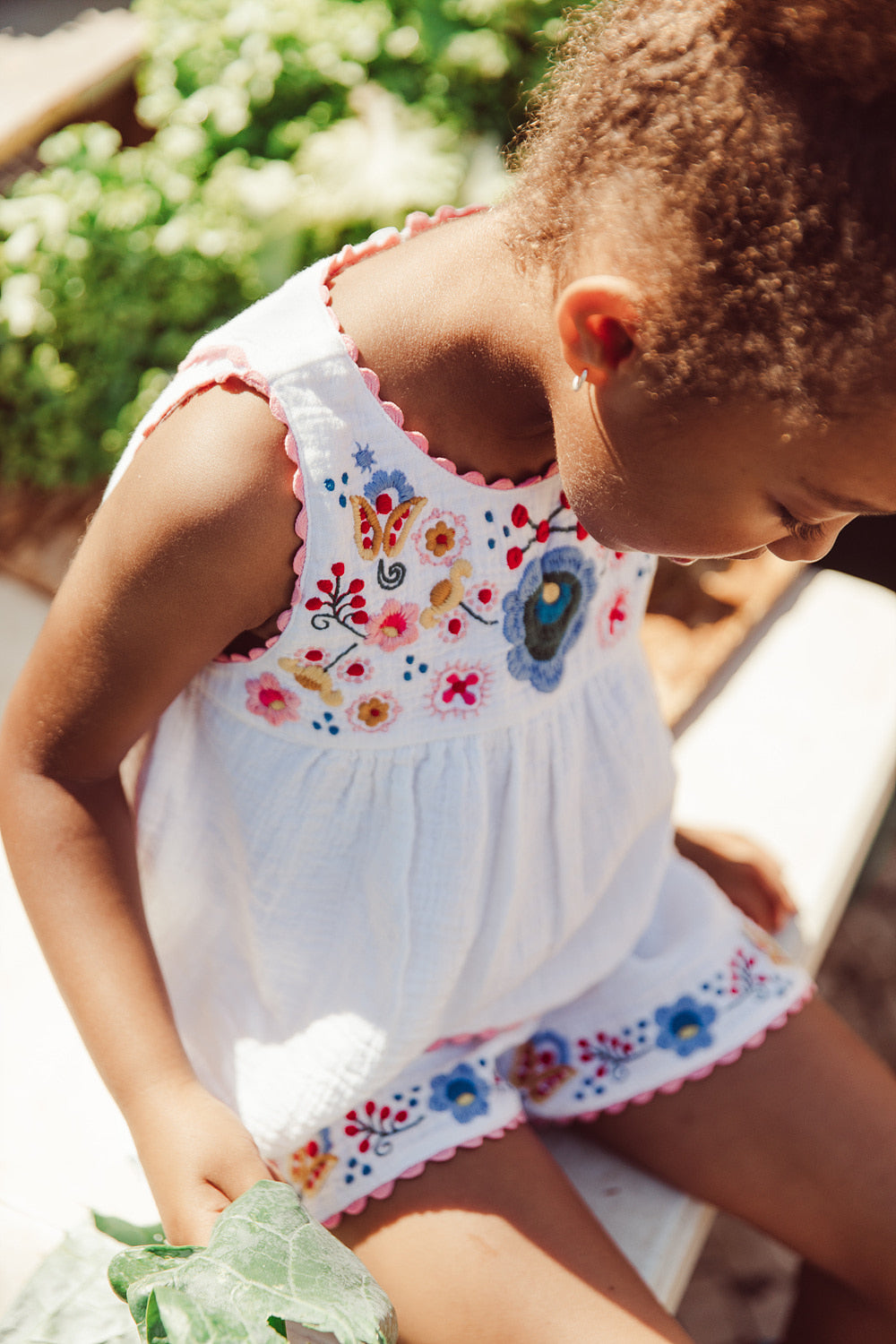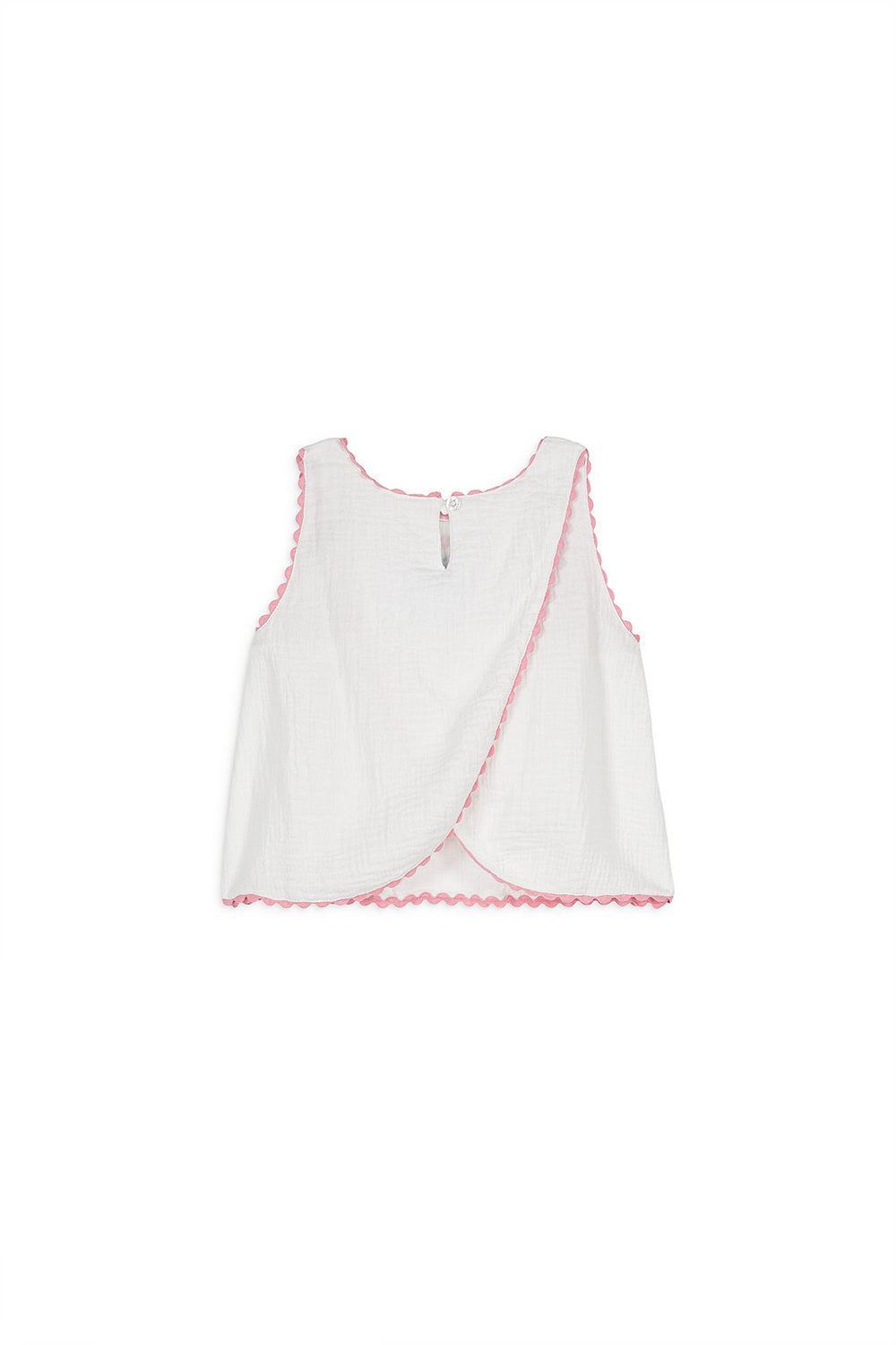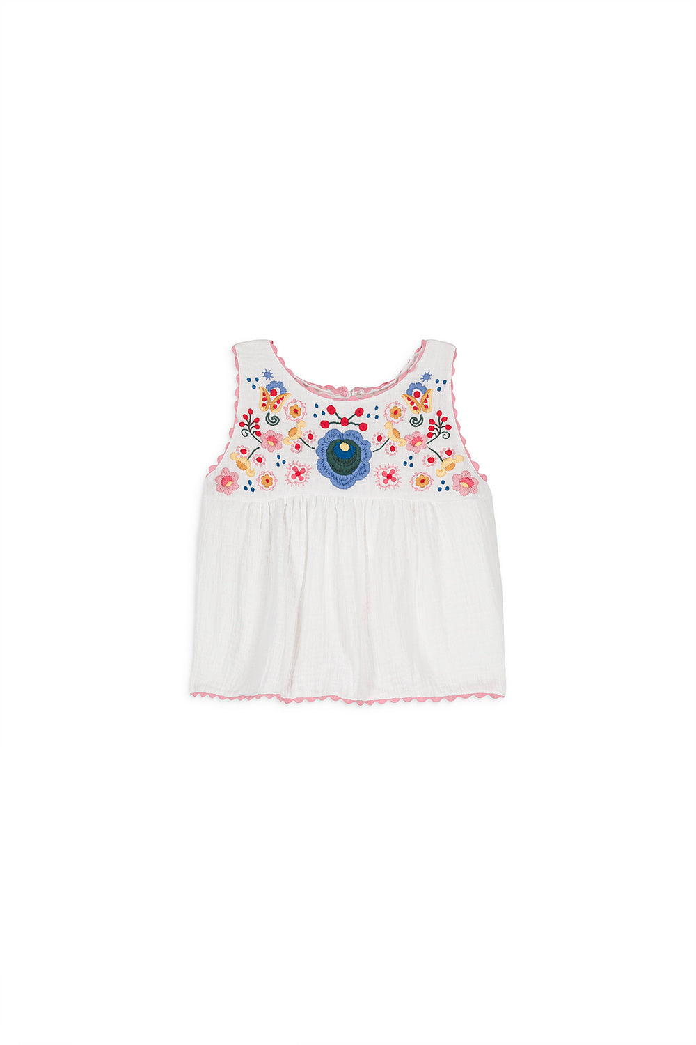 우리가 좋아하는 디테일:· 더블 코튼 거즈 탑 블라우스· 자수 디테일이 있는 가슴 부분 디테일· 네크라인, 암홀, 밑단에 리크랙 디테일· 뒷면 티어드롭 오프닝과 버튼 디테일· 뒷면의 둥근 크로스오버 패널, 리크랙 마감 처리, 낮은 등 부분이 드러나는 디자인* 참고: 3세 이하 사이즈는 뒷면 크로스오버 패널이 없으며, 대신 상단에서 하단까지 버튼이 달려 있습니다.물 온도 30°C 로 약하게 세탁표백 금지기계건조 금지낮은 온도로 다림질드라이클리닝뒤집어서 세탁화기에 가까지 하지 말 것