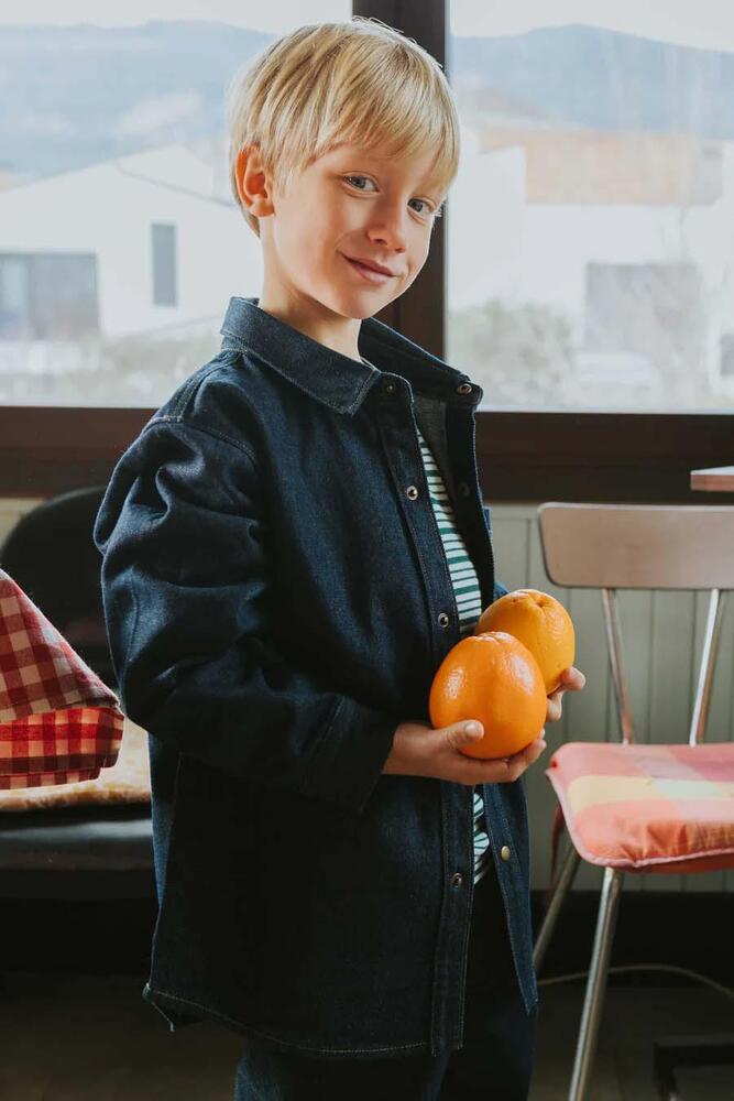 98% 면과 2% 엘라스테인으로 제작된 데님 셔츠 재킷입니다. 카라와 앞면의 메탈 스냅 버튼 여밈이 특징이며, 앞면에는 가슴 포켓이 있고 소매에는 커프스가 있습니다. 편안하고 여유로운 핏을 제공합니다.