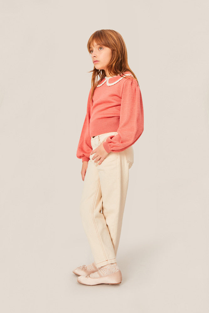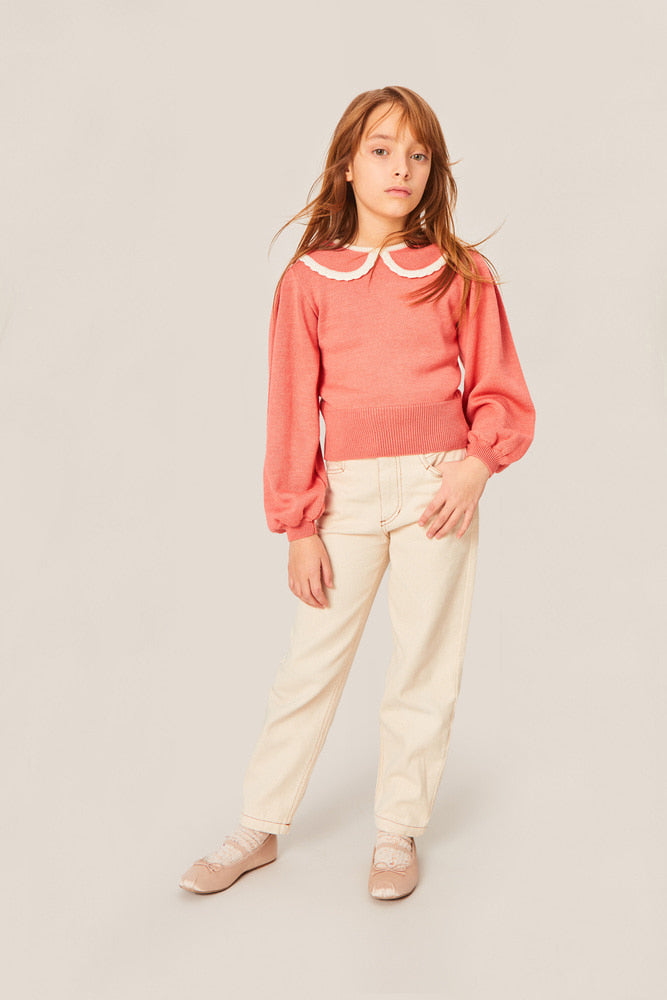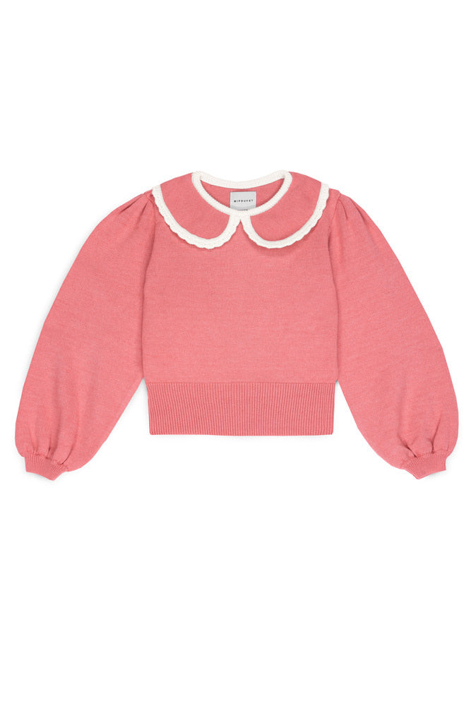 이 섬세한 니트 스웨터는 전통적인 레이어링에 신선한 변화를 제공합니다. 메리노 울 혼합 소재로 제작되어, 풍성한 소매와 대비되는 레이스 카라가 아름답게 어우러집니다.