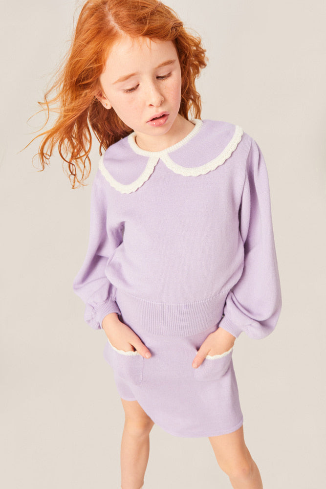 이 섬세한 니트 미니스커트는 전통적인 레이어링에 신선한 변화를 제공합니다. 메리노 울 혼합 소재로 제작되어 A라인 실루엣에 대비되는 레이스 장식이 더해졌습니다.