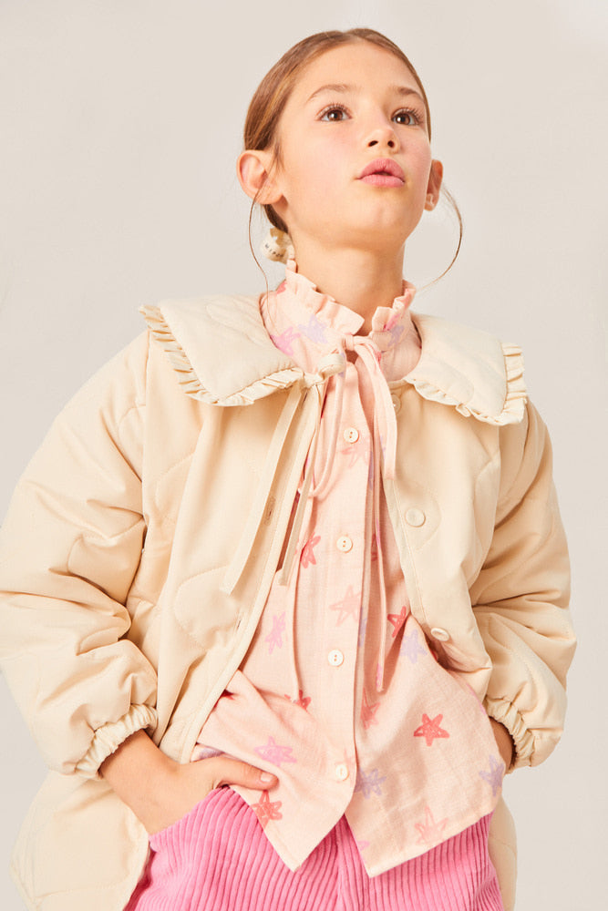 이 박시한 퀼팅 재킷으로 시크한 레이어링을 연출하세요. 오버사이즈 칼라는 실루엣에 스타일리시한 매력을 더하며, 여성스러운 프릴과 섬세한 리본 타이로 완성되었습니다.