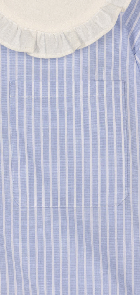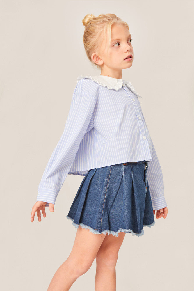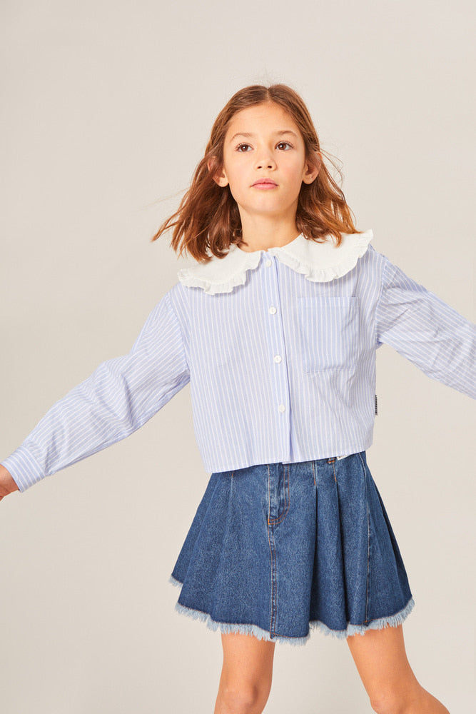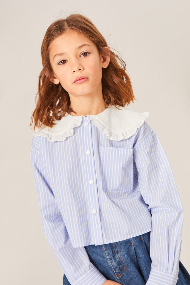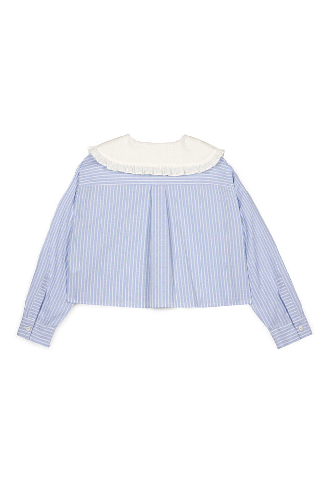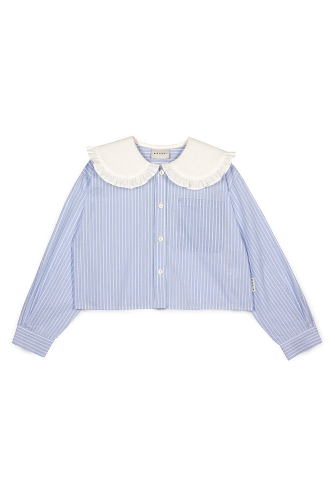 현대적인 디자인이 돋보이는 이 오버사이즈 크롭 블라우스는 그 대표적인 예시입니다. 핀스트라이프 면 원단으로 제작되었으며, 눈에 띄는 프릴 칼라와 MIPOUNET 로고 라벨이 특징입니다.