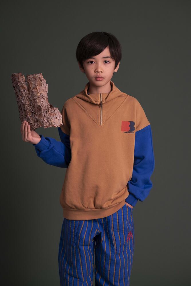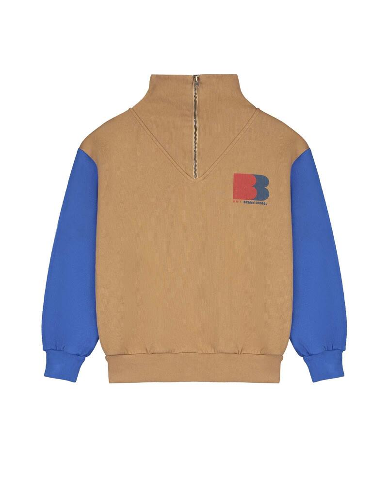 지퍼가 달린 카라, 신축성 있는 소매, 소매 색상이 다른 스웨트셔츠. 가슴에 BB 프린트가 있습니다. 100% 오가닉 코튼 플리스. Made in Spain.