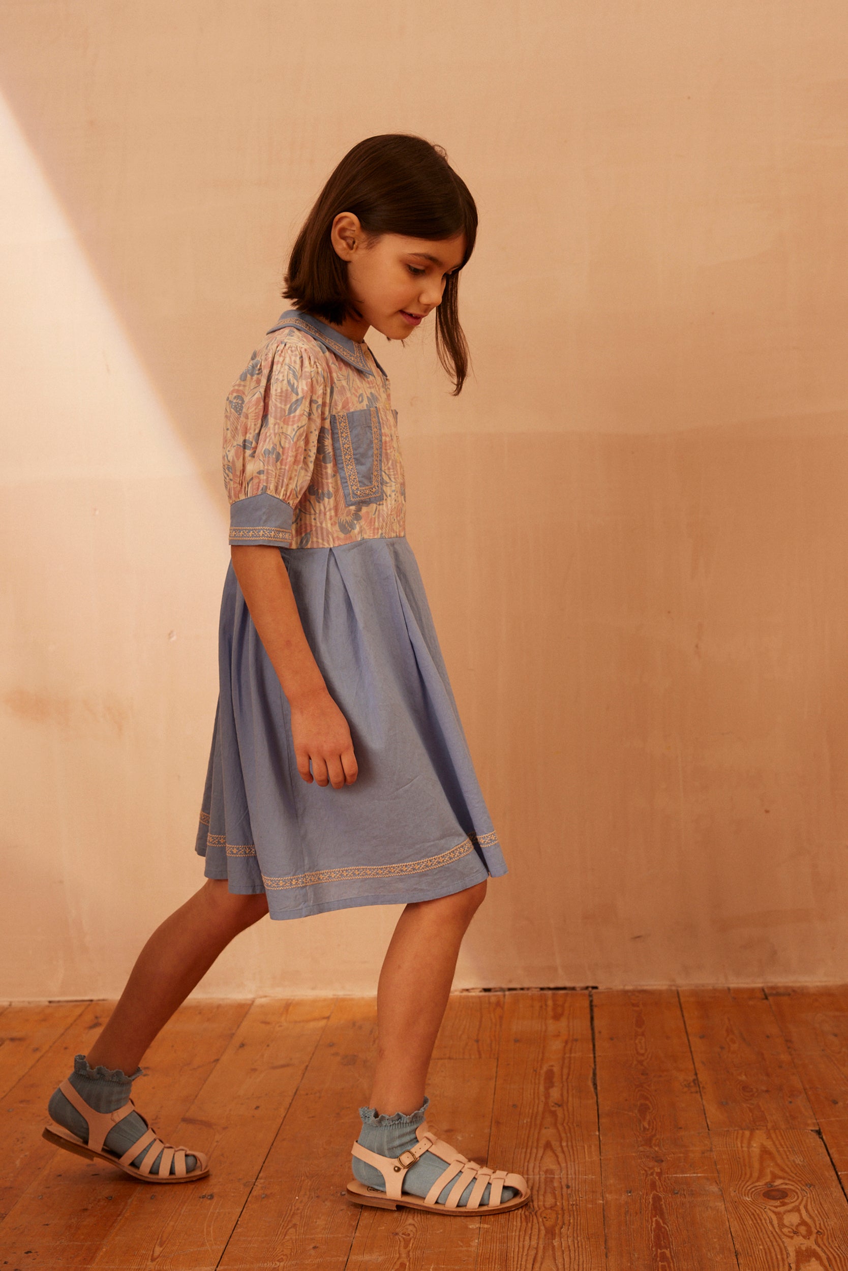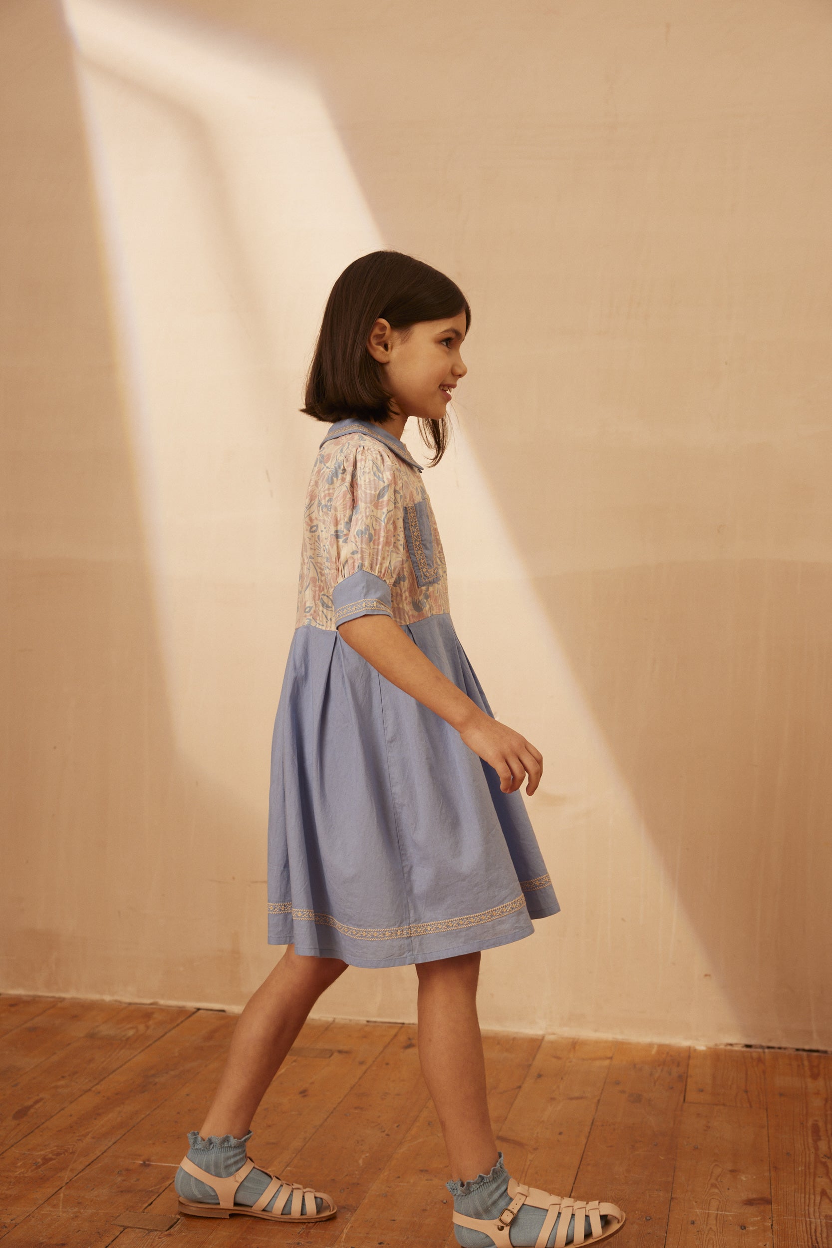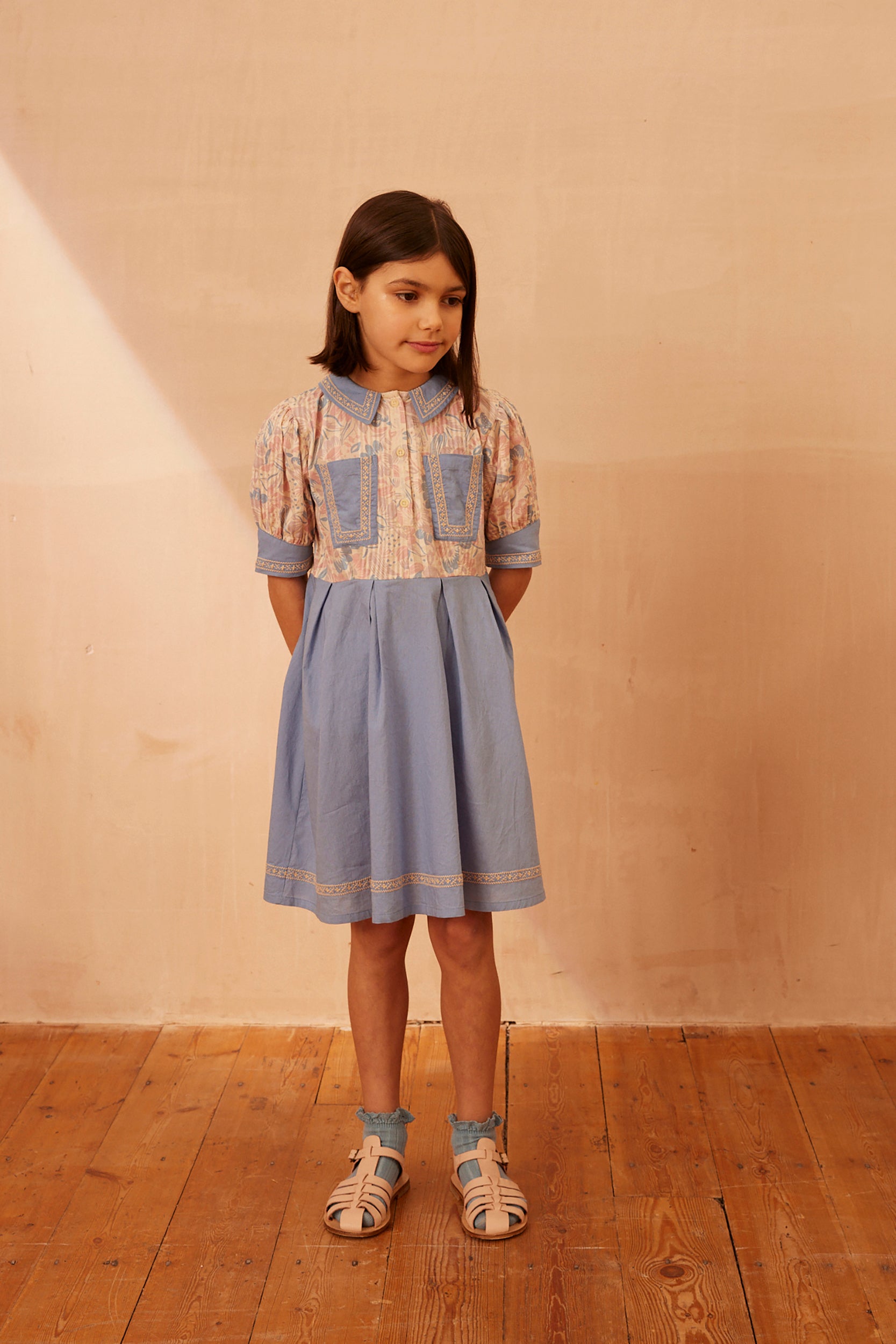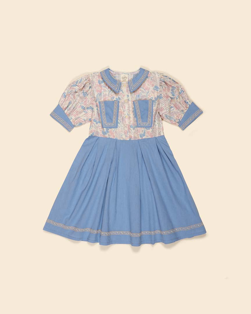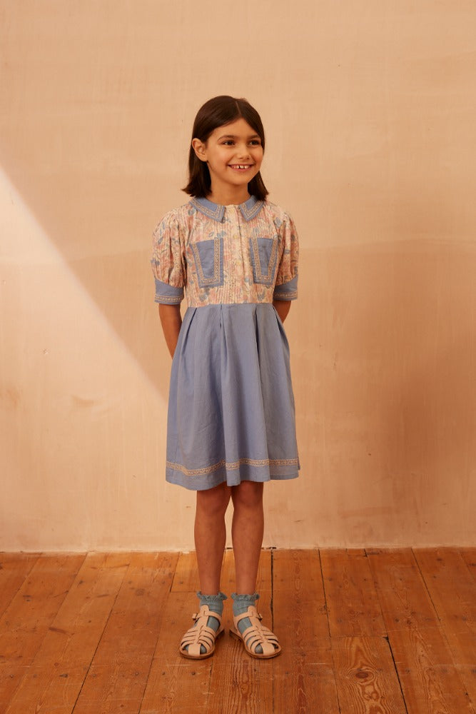 ★ 패키지 손상이 심한 일부 제품은 일반 투명 OPP 봉투로 교체되어 발송될 수 있습니다. 이 점 양해 부탁드립니다. Kay 드레스50’s 플로랄달콤한 레트로 스타일의 드레스, Kay는 ‘50s 플로랄’과 ‘콘플라워’ 면 원단으로 제작되어 1950년대의 핏 앤 플레어 실루엣을 자랑합니다. 정교한 선형 자수로 헴라인을 장식하고, 대비를 이루는 ‘콘플라워’ 칼라, 커프스, 주머니에 트리밍을 더했습니다. 앞면 버튼 플래킷과 허리 부분에 사이드 지퍼가 있어 입기 편리합니다. Kay는 양말과 루시 신발과 함께 빈티지한 여름 휴가 느낌으로 스타일링하기 좋습니다.100% 면 (프린트된 시어서커 / 직조 도비)인도에서 윤리적으로 제작손세탁 권장사이즈:2-3세: 드레스 길이 49cm3-5세: 드레스 길이 55cm5-7세: 드레스 길이 61cm7-9세: 드레스 길이 70cm스튜디오 촬영에서 Ilaria는 128cm 키이며 7-9세 샘플을 착용하고 있습니다.