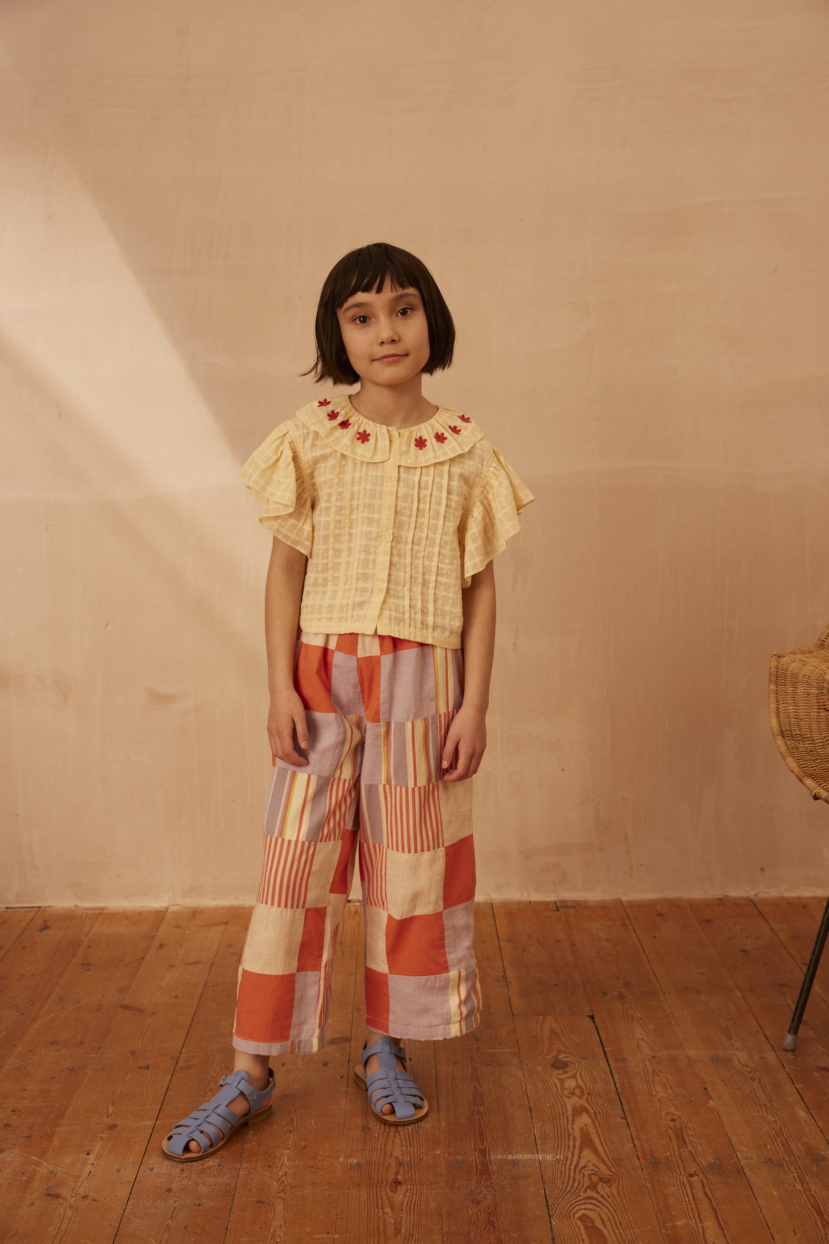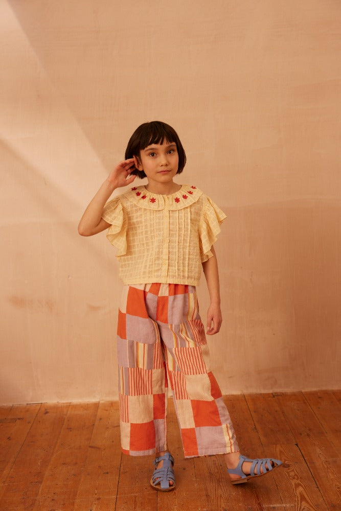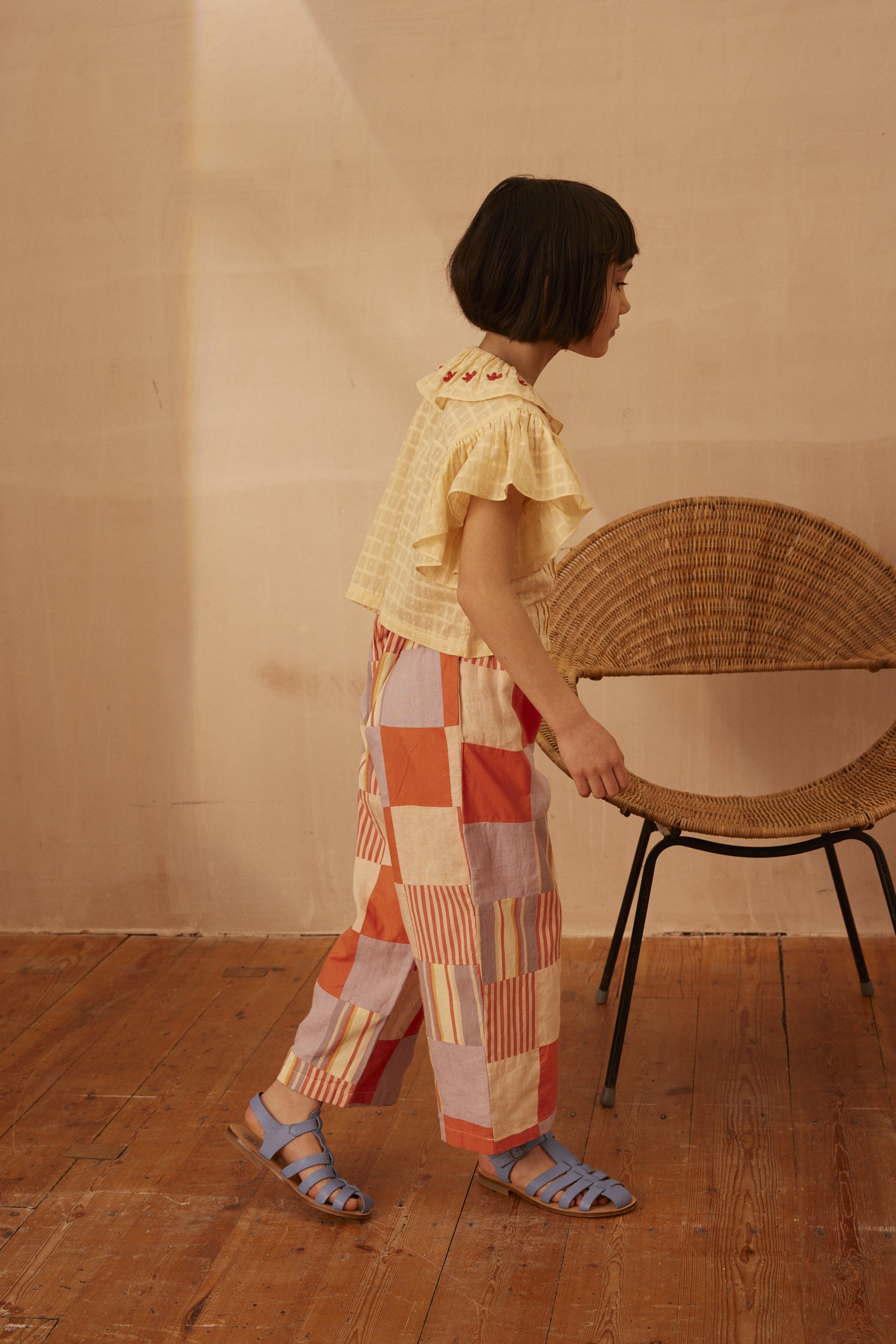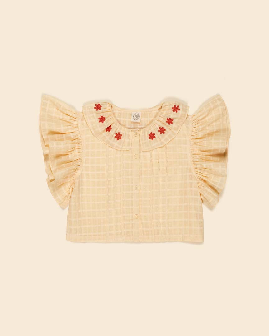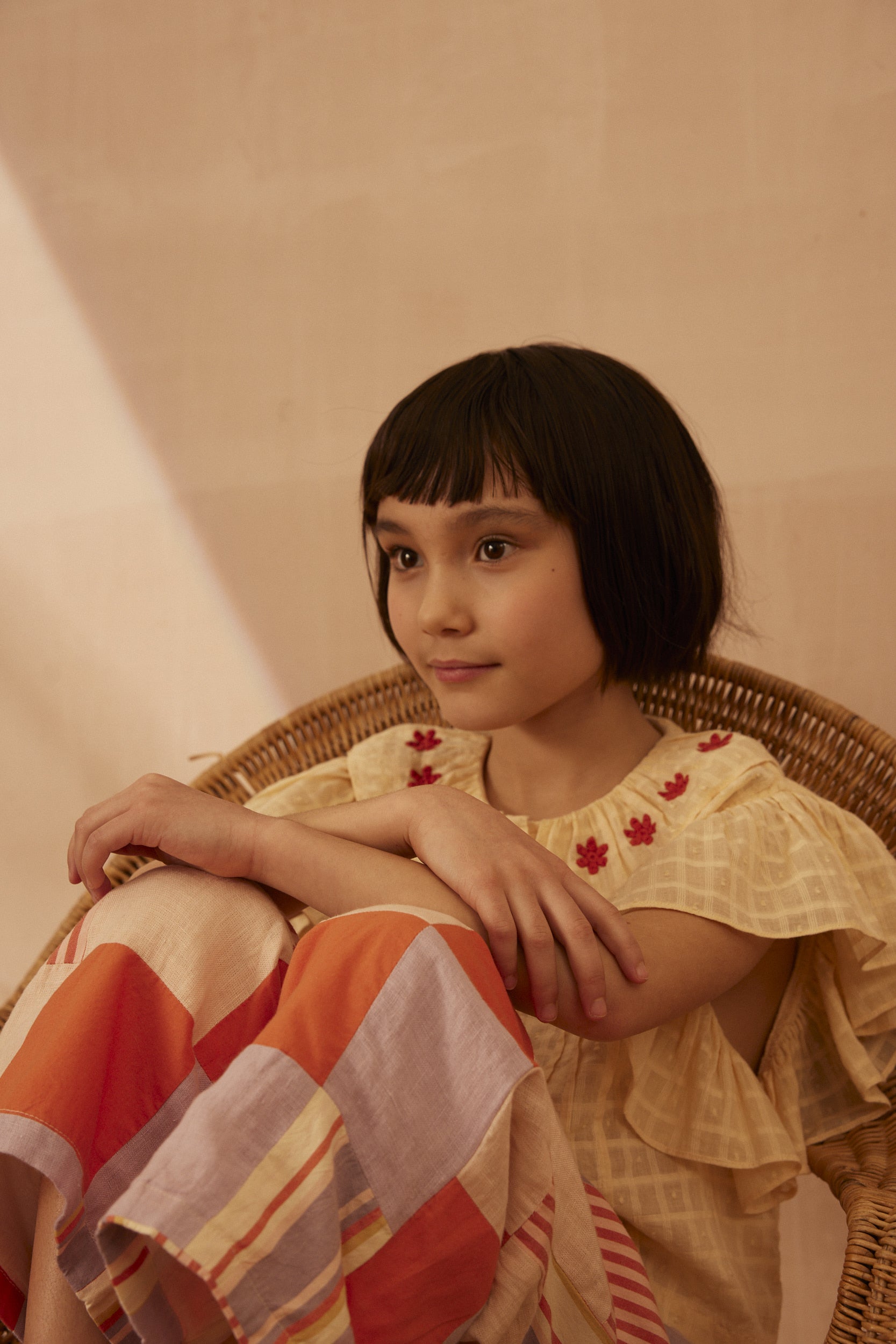 ★ 패키지 손상이 심한 일부 제품은 일반 투명 OPP 봉투로 교체되어 발송될 수 있습니다. 이 점 양해 부탁드립니다.Silvie 블라우스 - MilkSilvie는 사랑스러운 빈티지 무드의 블라우스로, 로맨틱한 분위기가 돋보이는 아이템입니다. 부드러운 ‘milk’ 도비 코튼 소재로 제작되었으며, 프릴 칼라를 따라 ‘dahlia’ 컬러의 자수가 포인트로 들어가 있습니다. 핀턱 플리츠와 버튼다운 디자인이 특징이며, 살짝 크롭된 실루엣으로 다양한 스타일링이 가능합니다. 원피스 위에 레이어링하거나, 하이웨이스트 쇼츠 및 팬츠, 오버롤과 매치하면 더욱 멋스럽습니다.소재: 100% 코튼 (셀프 체크)Made responsibly in India.손세탁 권장사이즈 안내2-3세: 블라우스 길이 30.5cm3-5세: 블라우스 길이 33.5cm5-7세: 블라우스 길이 36.5cm7-9세: 블라우스 길이 39.5cm9-11세: 블라우스 길이 42.5cm스튜디오 촬영 컷에서 모델 Momo는 키 129cm이며 7-9세 샘플을 착용했습니다.