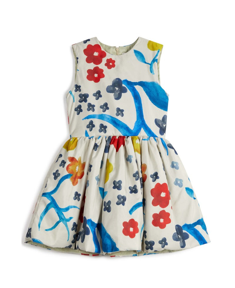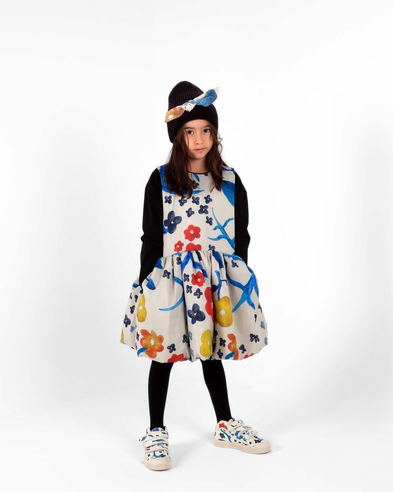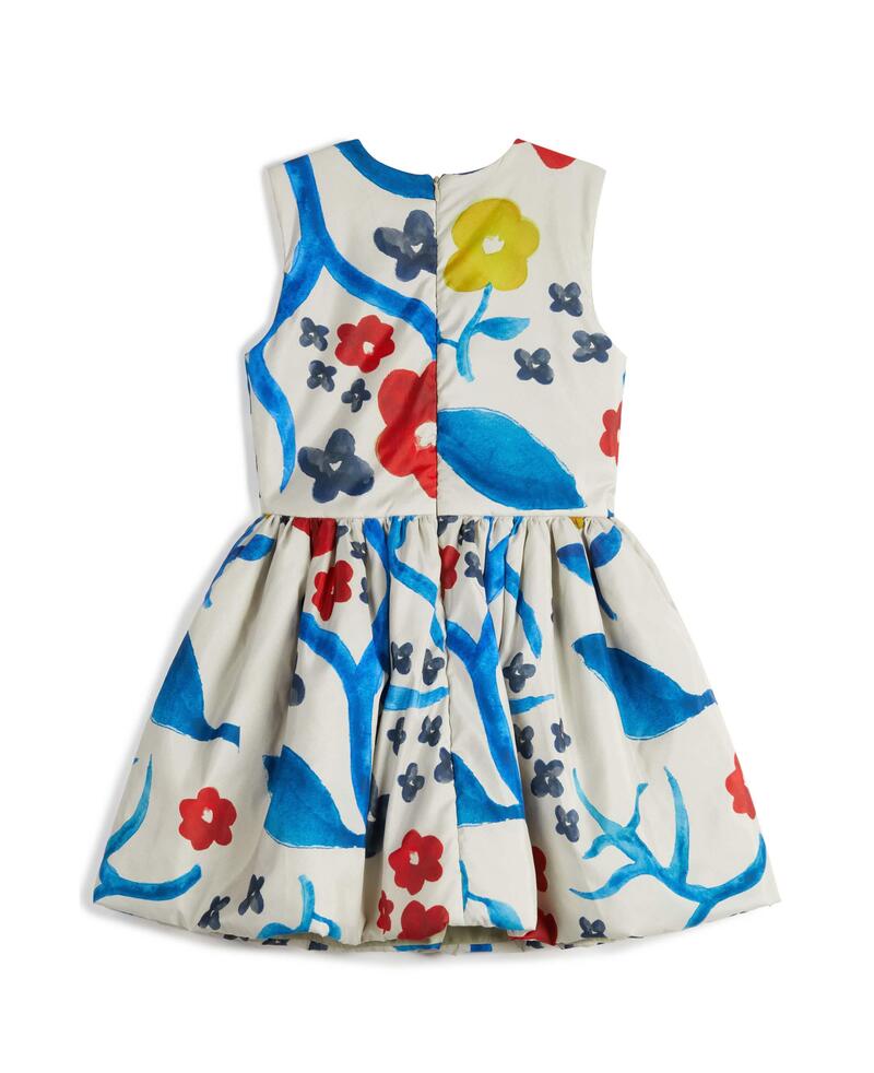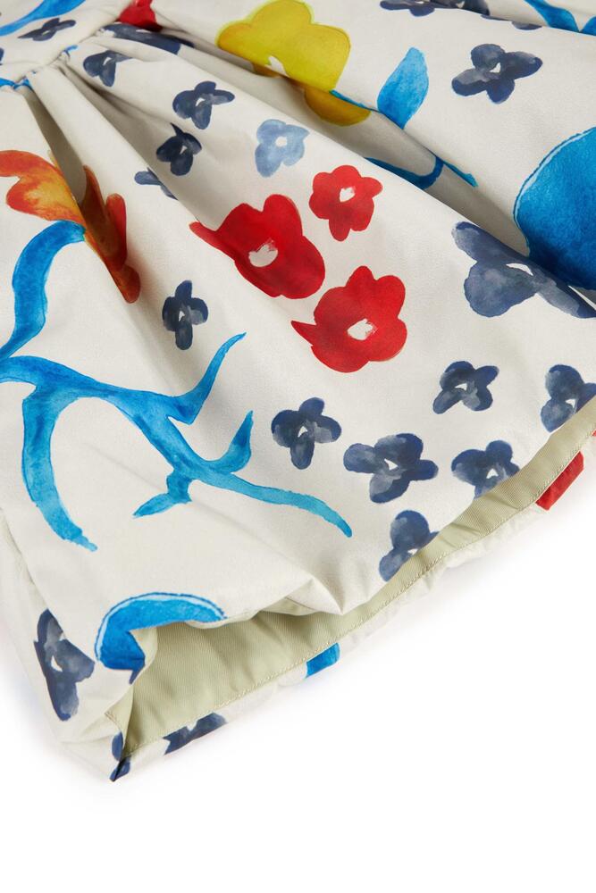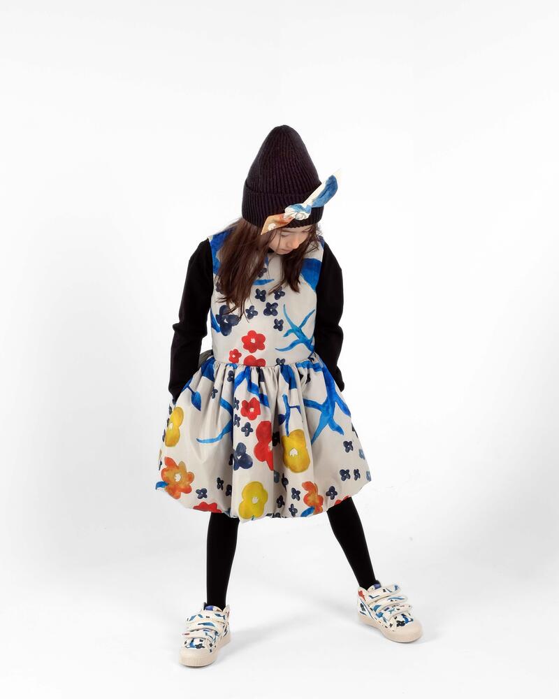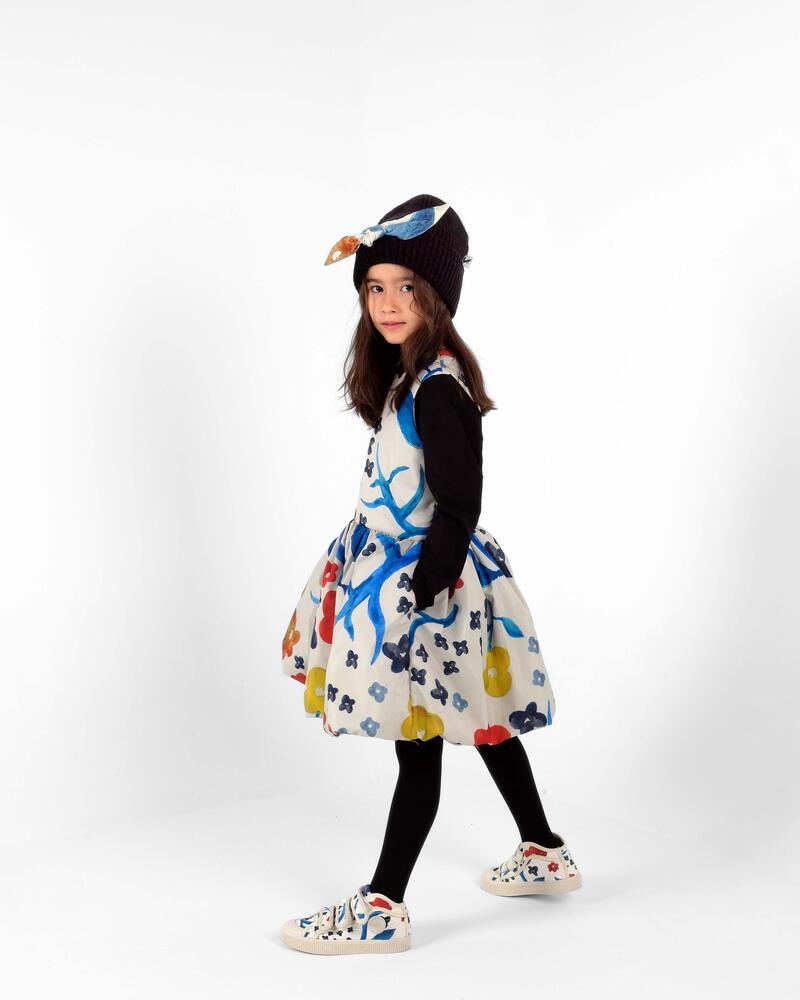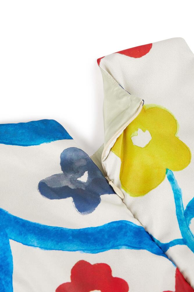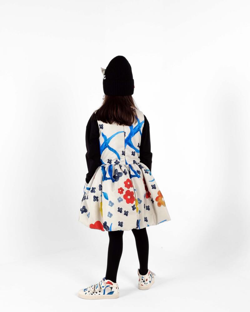 100% 재생 폴리에스터 패딩, 100% 폴리에스터 안감, 52% 비스코스 48% 폴리에스터 소재의 슬리브리스 패딩 플레어 드레스입니다. Made in Portugal.