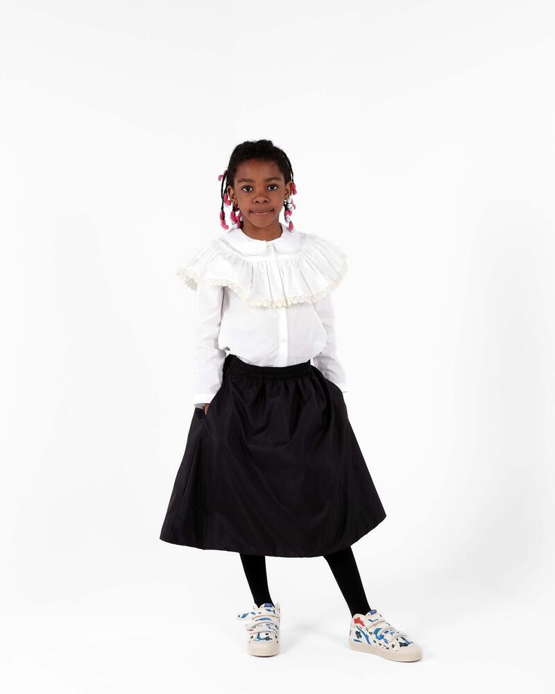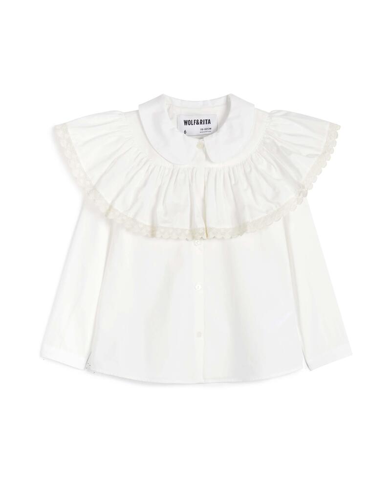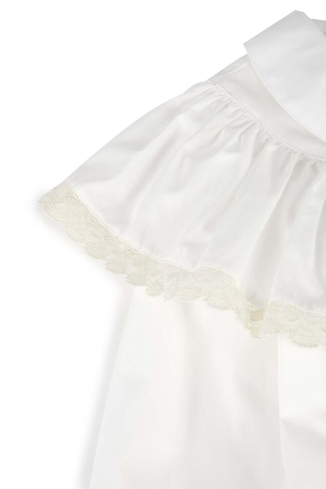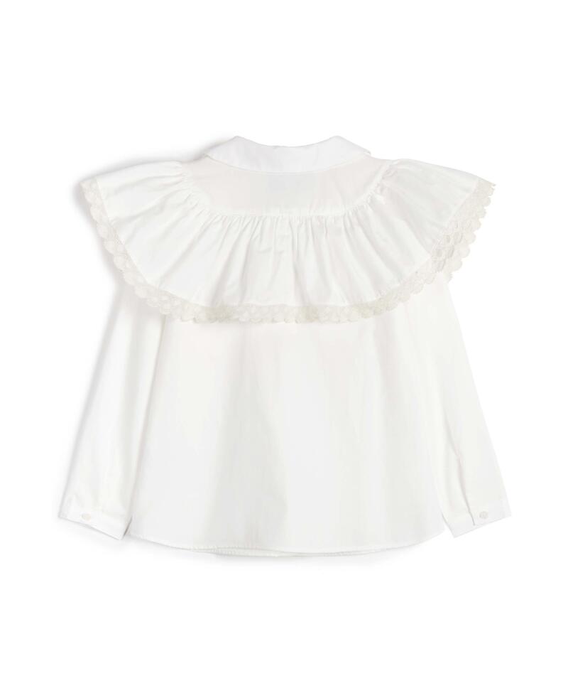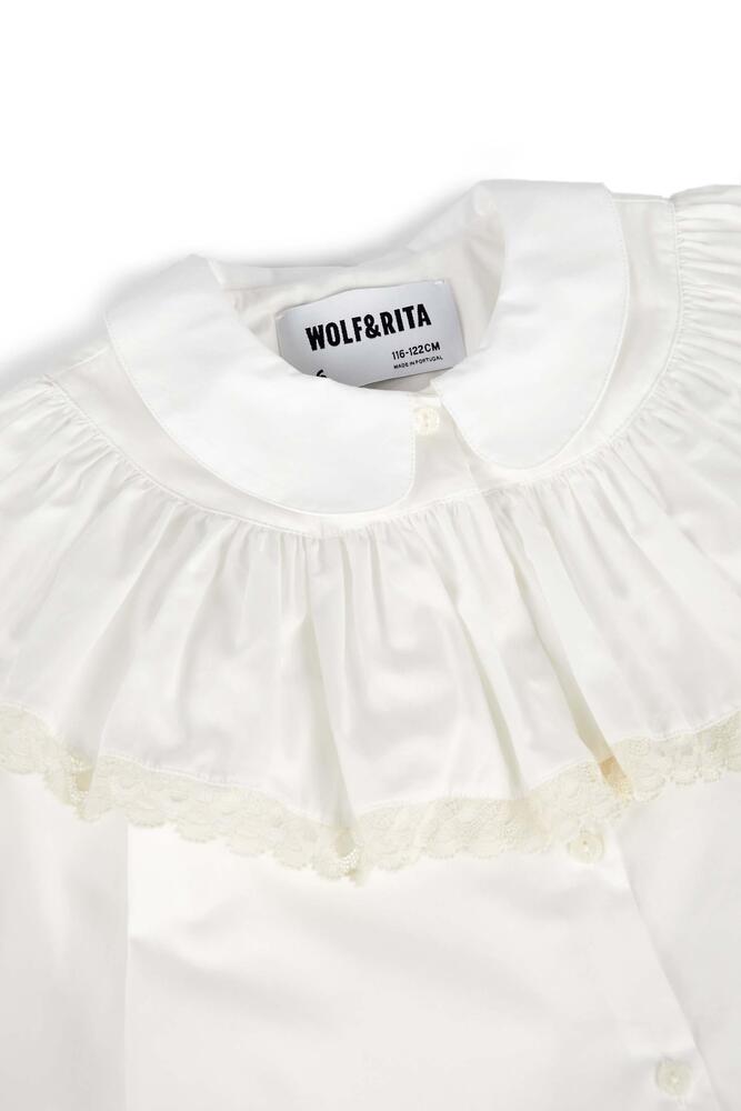 100% 유기농 면 (GOTS 인증) 소재의 긴 소매 프레리 블라우스입니다. 앞면 버튼, 신축성 있는 소매, 라운드 카라, 주름 장식 레이스 디테일, 소매 버튼이 특징입니다. Made in Portugal.
