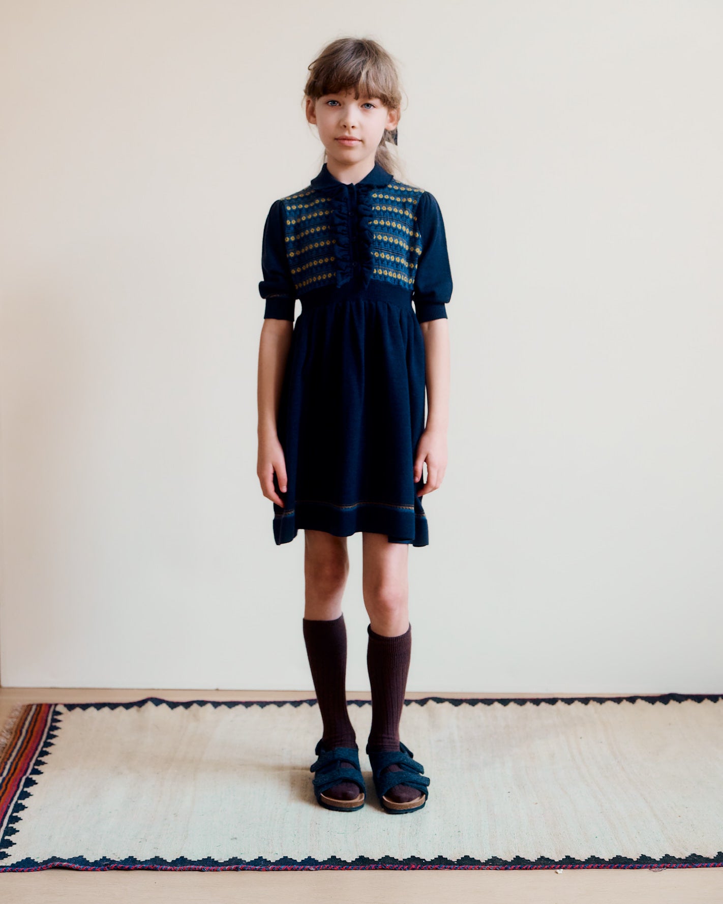우리의 Aneto 드레스는 손쉬운 실루엣과 은은한 러플 플라운스 디자인으로 이번 시즌 다시 돌아왔습니다. 고급 네이비 메리노 울로 제작된 이 드레스는 버튼을 통해 여유로운 핏을 제공합니다. Made in China.