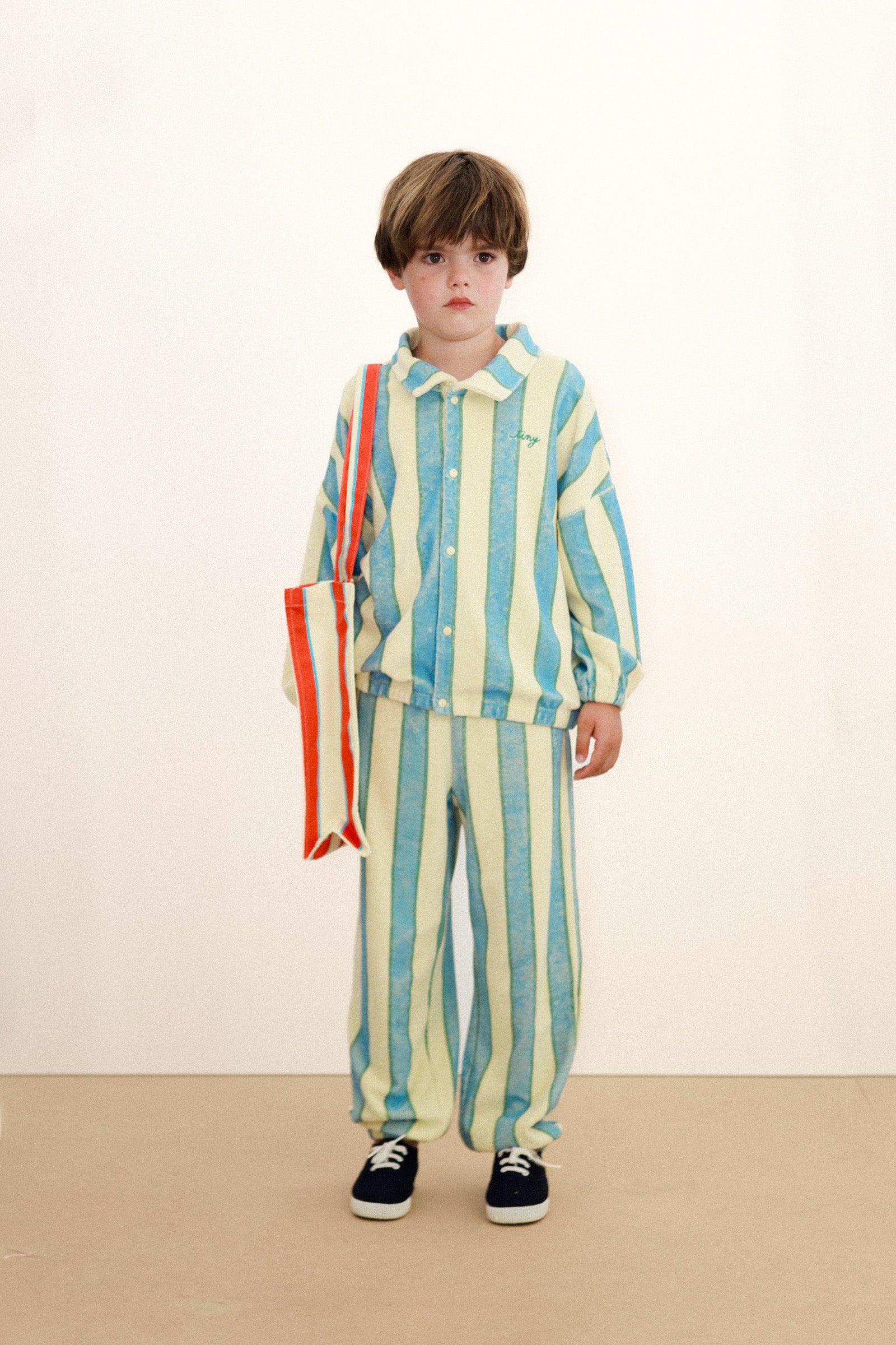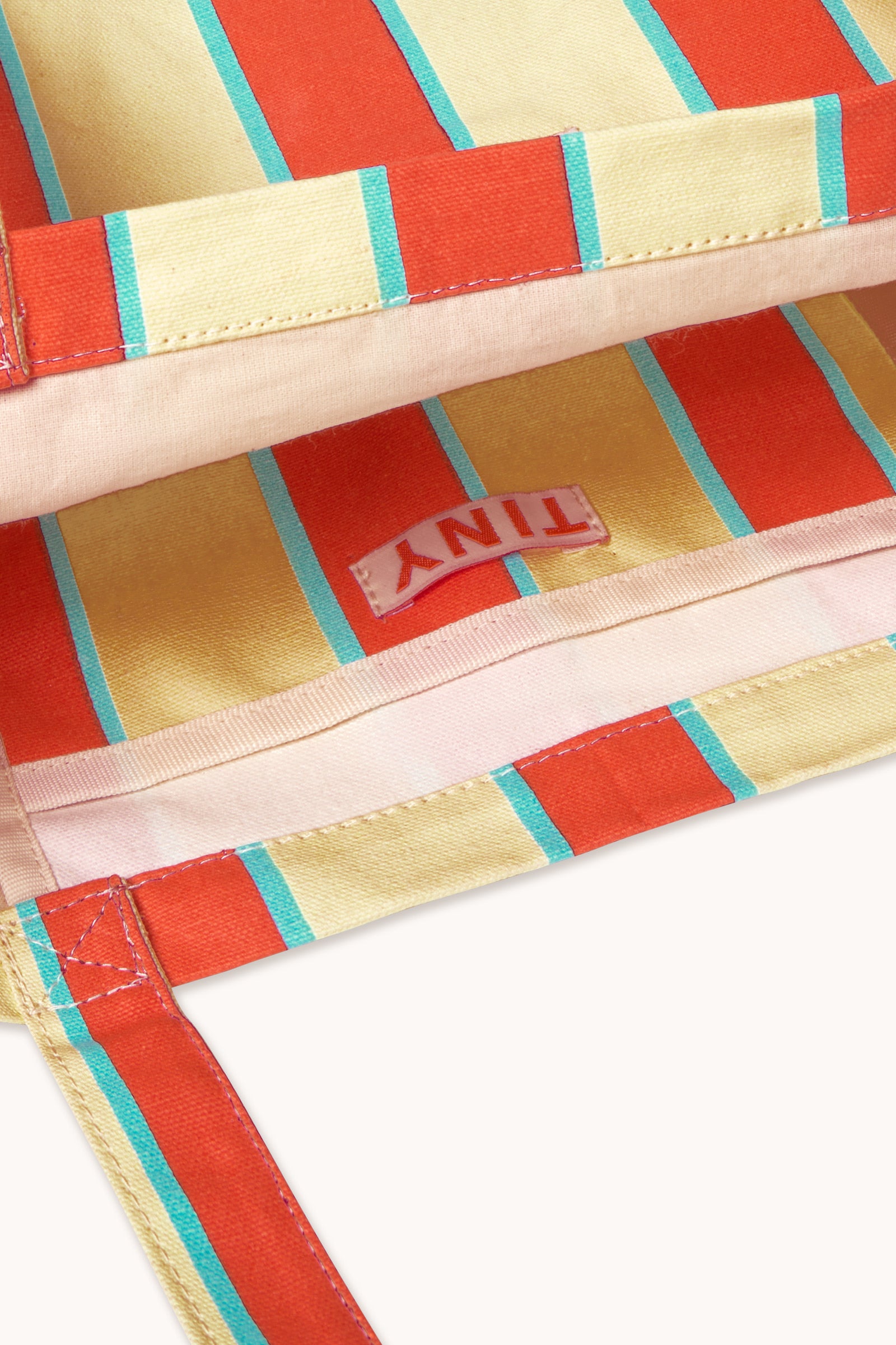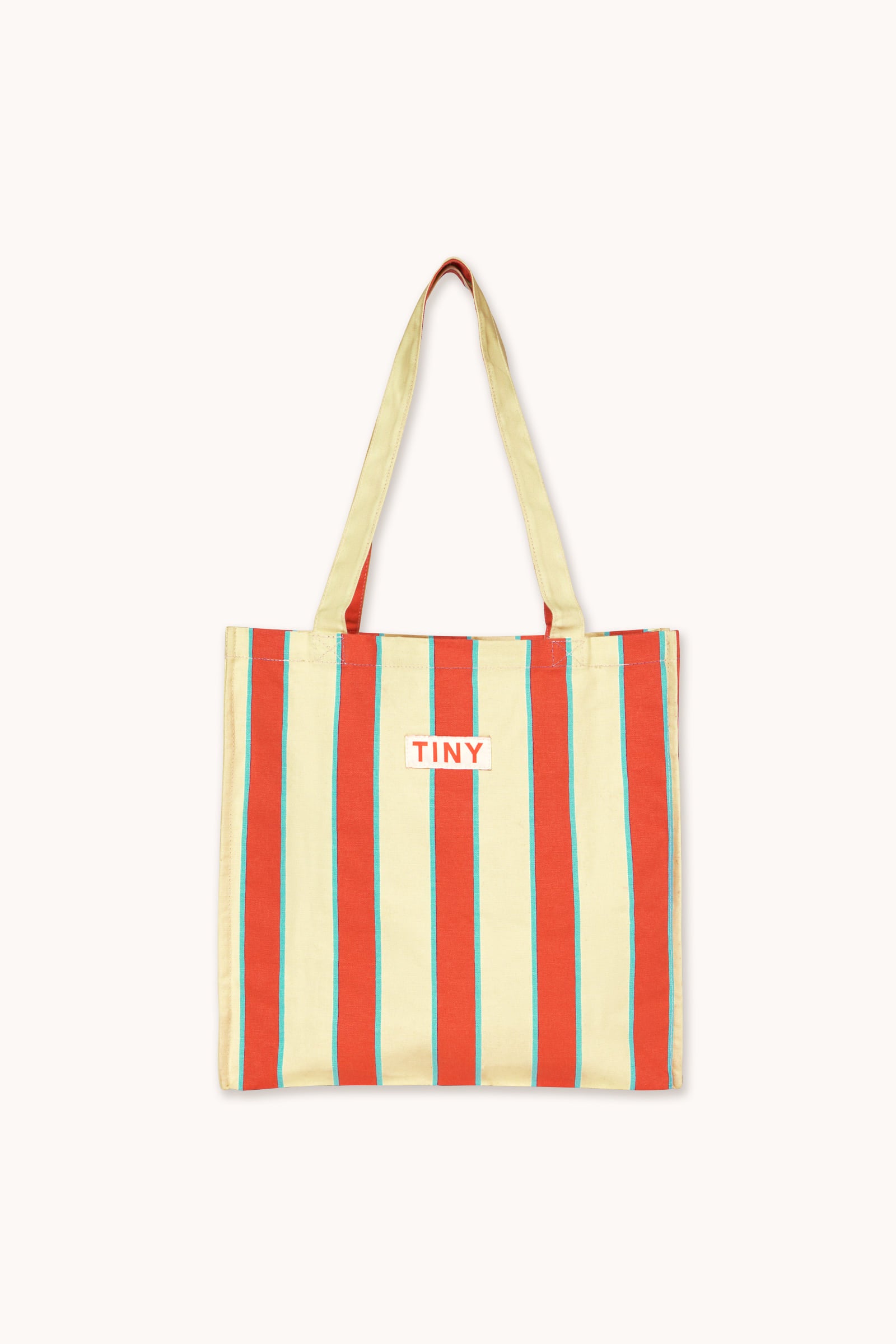 소재: 코튼 100%사이즈: 높이 34cm x 너비 34cm x 깊이 11cm.파스텔 옐로우 컬러 바탕에 레트로 스트라이프 프린트를 더한 탄탄한 소재의 토트 백으로, 손에 들거나 어깨에 메기 좋은 넉넉한 핸들 디자인이 특징입니다. 데일리 소지품을 충분히 수납할 수 있는 여유로운 내부 공간을 갖추었으며, 상단에 더해진 TINY 로고 디테일이 감각적인 포인트를 더합니다. Made in China.· 물세탁 금지· 표백제 사용 금지· 건조기 사용 금지· 다림질 금지· 드라이클리닝 금지· 오염 시 물기를 적신 천으로 가볍게 닦아주세요.· 세탁 전 상품 내부에 부착된 케어 라벨(세탁 택) 확인 필수· 소재 및 프린트 특성상 단독 세탁 권장