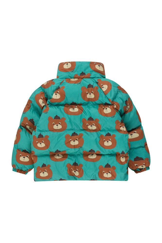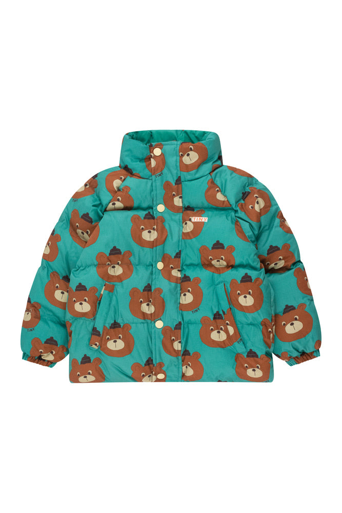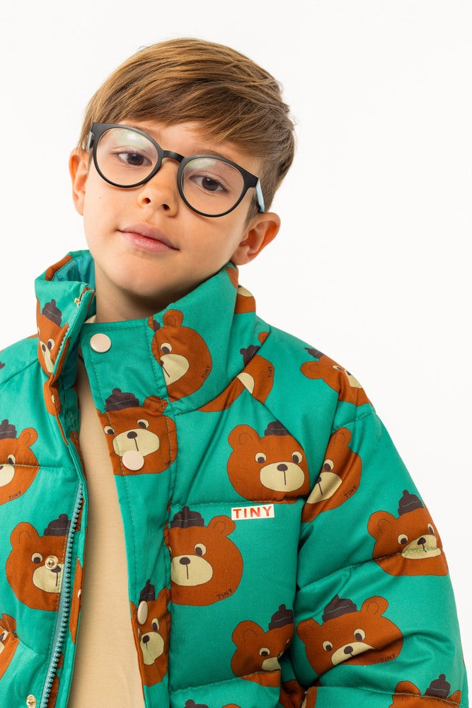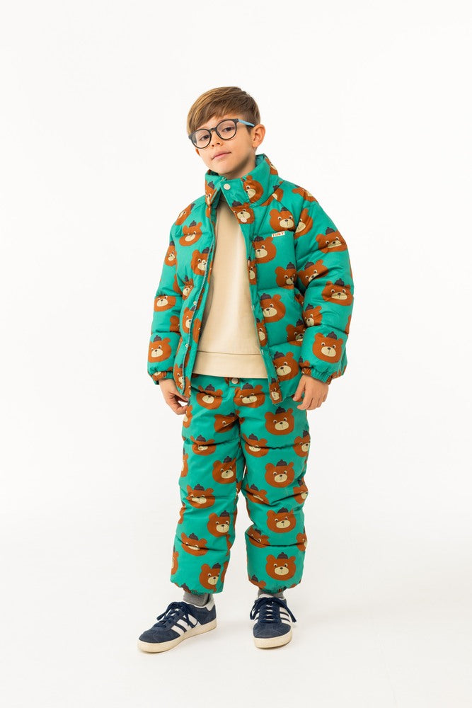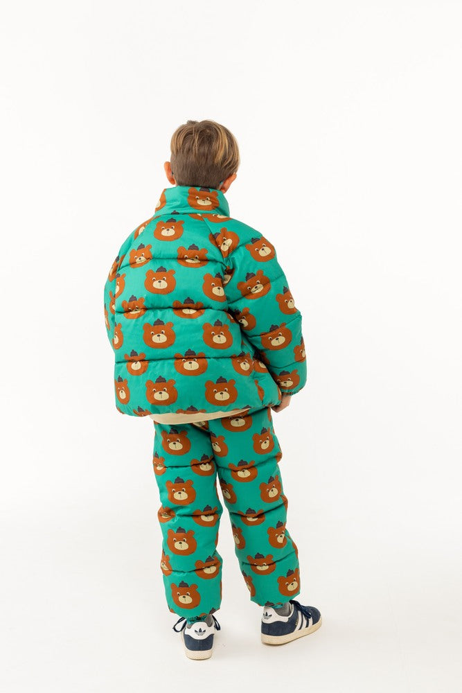 아주 따뜻한 이 에메랄드 패딩 재킷은 100% 면으로 제작된 곰 프린트 외관과 두툼한 패딩의 내장으로 제작되었습니다. 재킷에는 하이넥 디자인과 풀 지퍼가 있으며, 추가적인 따뜻함을 제공하는 스냅 프론트 플래킷과 셰르파 안감 포켓이 있습니다. 일상적인 착용에 적합합니다. Made in China.