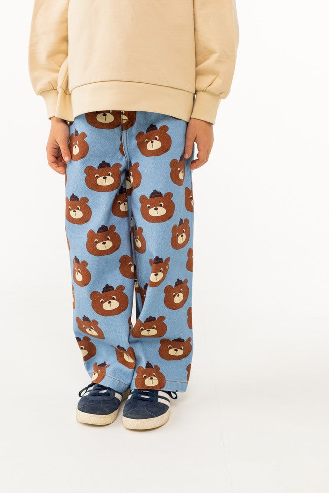 이 데님 블루 진은 전체적으로 곰 프린트가 되어 있으며, 100% 면으로 제작되었습니다. 버튼과 지퍼 여밈, 사이드 포켓이 있으며, 스트레이트 핏으로 일상적인 착용에 적합합니다. Made in China.