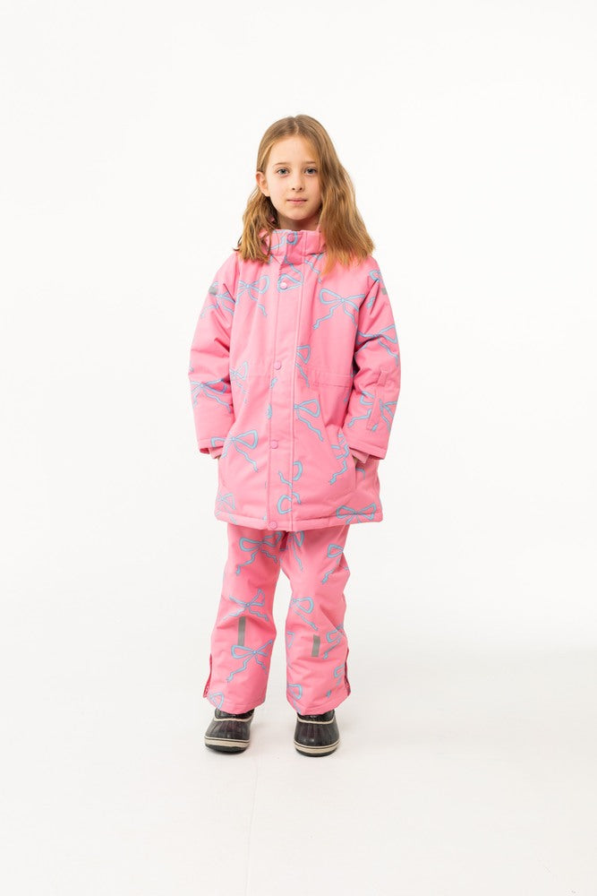 이 핑크색 보우 스노우 재킷은 스키 슬로프에서부터 일상까지 아기들을 따뜻하고 건조하게 유지해 줍니다! 재킷은 셰르파 안감 패널과 라이닝된 포켓으로 추가적인 따뜻함을 제공하며, 탈부착 가능한 후드, 리브 커프스, 부드러운 플리스 지퍼 가드가 있는 전체 지퍼, 완벽한 핏을 위한 조절 가능한 내부 허리 밴드, 그리고 안전을 위한 팔과 후드에 반사 스트립이 특징입니다. Made in China.