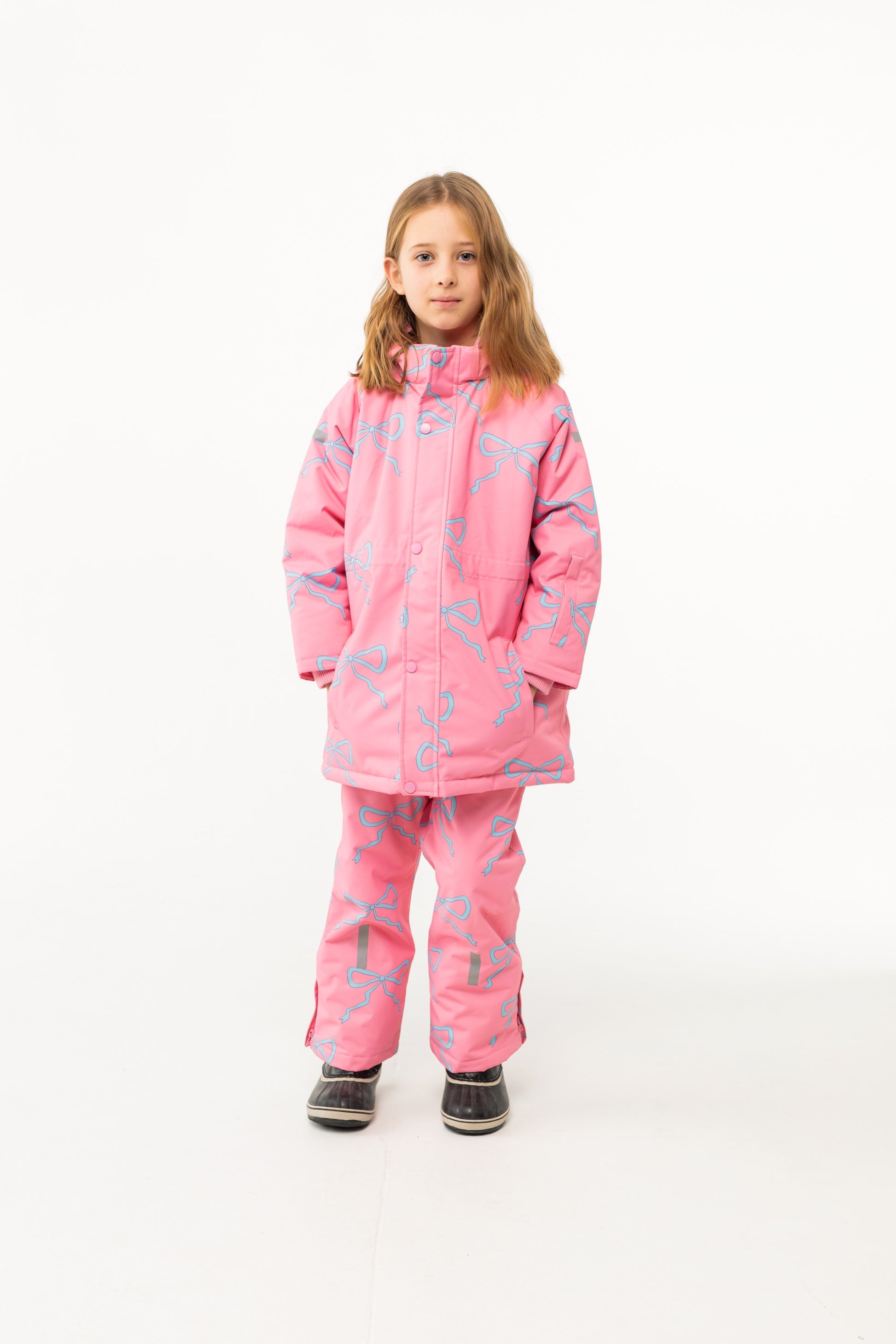 이 핑크색 보우 스노우 팬츠는 스키 슬로프에서부터 일상까지 아기들을 따뜻하고 건조하게 유지해 줍니다! 이 패딩 바지는 스냅 여밈이 있는 지퍼 플라이, 전체적인 플리스 안감으로 추가적인 따뜻함을 제공하며, 내부 리브 헴과 스키 부츠 위에 맞출 수 있는 발목 지퍼, 완벽한 핏을 위한 벨크로 탭이 있는 엘라스틱 허리, 그리고 안전을 위한 반사 스트립이 특징입니다. Made in China. 겉감: 100% 폴리에스터, 안감: 100% 폴리에스터, 패딩: 100% 폴리에스터