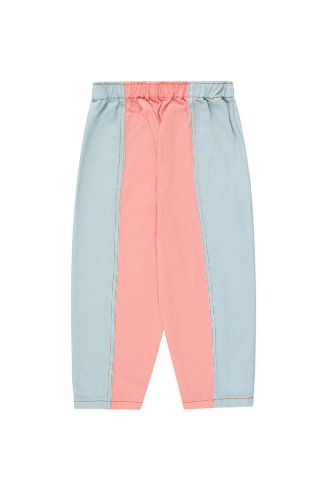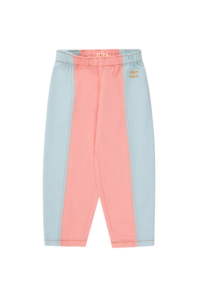 이 피치와 블루 컬러 블록 팬츠는 100% 면 트윌로 제작되었습니다. 허리에는 밴딩이 들어가 있고, 밑단이 좁아지며 은은한 배럴 실루엣을 제공합니다. Made in China.