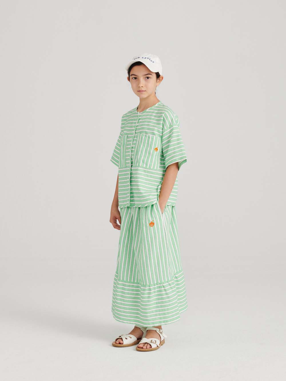 스커트 n04 나일 그린은 100% 얀 다이드 코튼으로 제작되었으며, 앞면에는 우리의 새 로고가 자수되어 있습니다. 이 미디 러플 스커트는 신축성 있는 밴드, 사이드 포켓 및 아래쪽에 러플이 디자인되었습니다. Made in Spain.모델의 키는 130cm이며, 6-7Y 사이즈를 착용하고 있습니다.