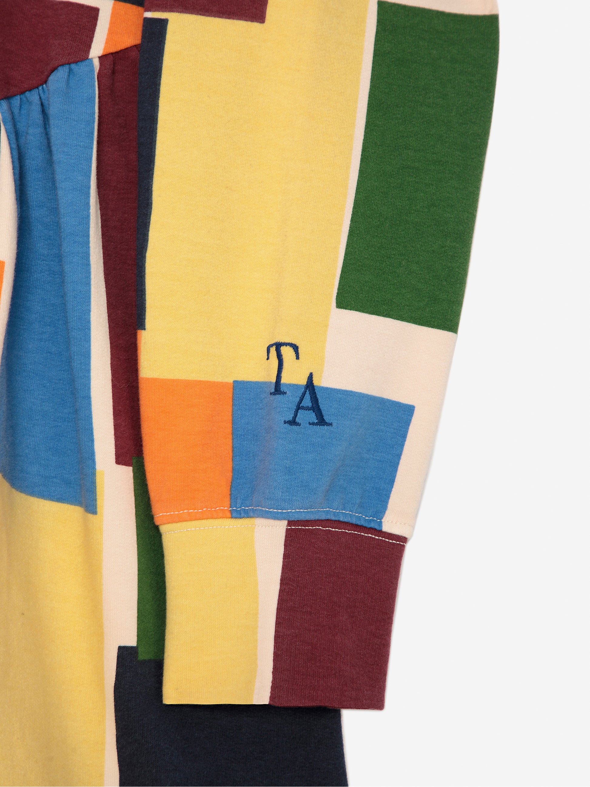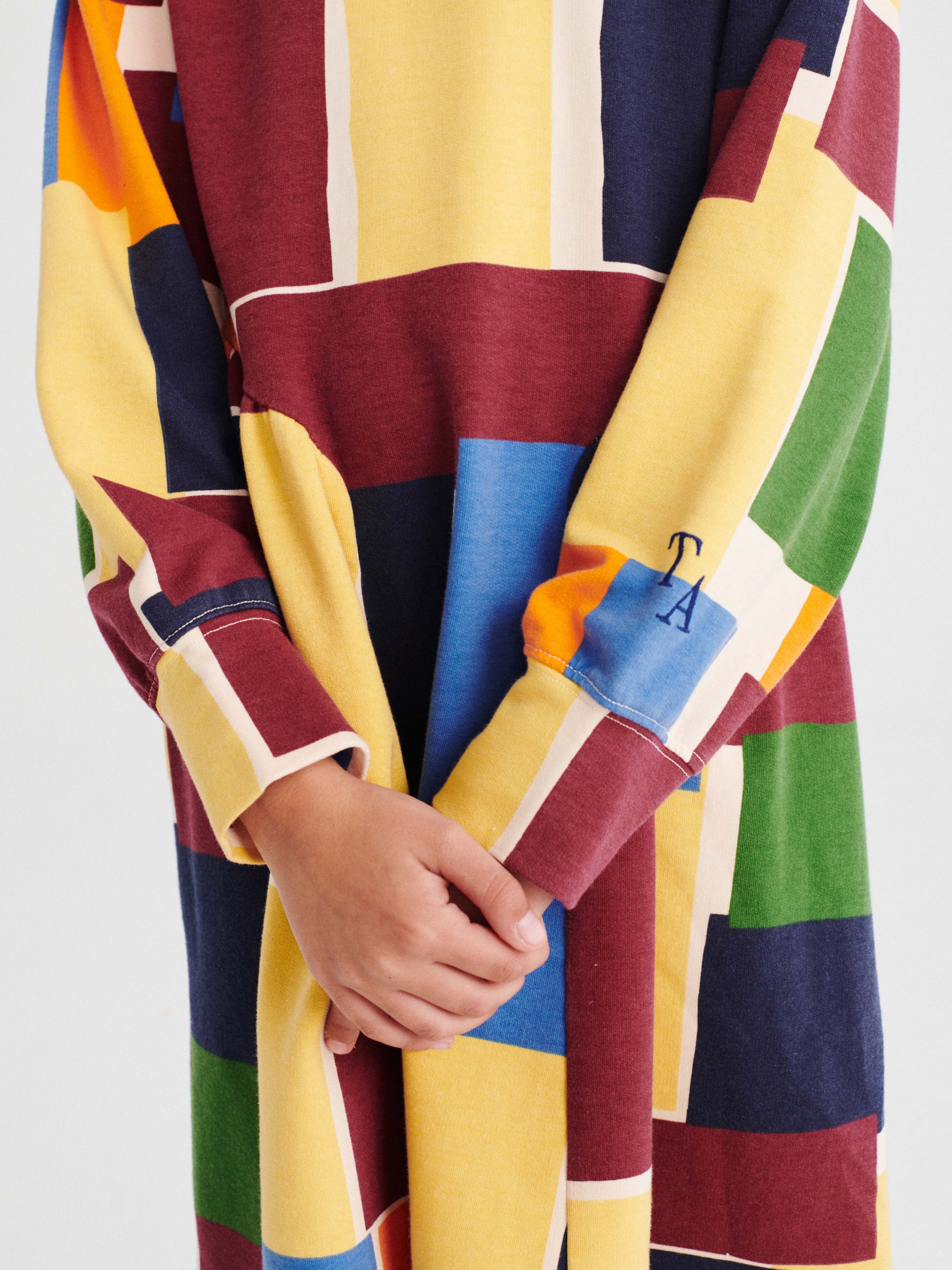 Orphic 드레스는 94% 유기농 면과 6% 엘라스테인으로 제작되었으며, 시선을 사로잡는 오르픽 전면 프린트가 특징입니다. 긴 소매와 드롭 숄더, 라운드 넥라인이 특징입니다. 미디 길이의 드레스입니다. Made in Spain.모델의 키는 133cm이며, 6-7Y 사이즈를 착용하였습니다.