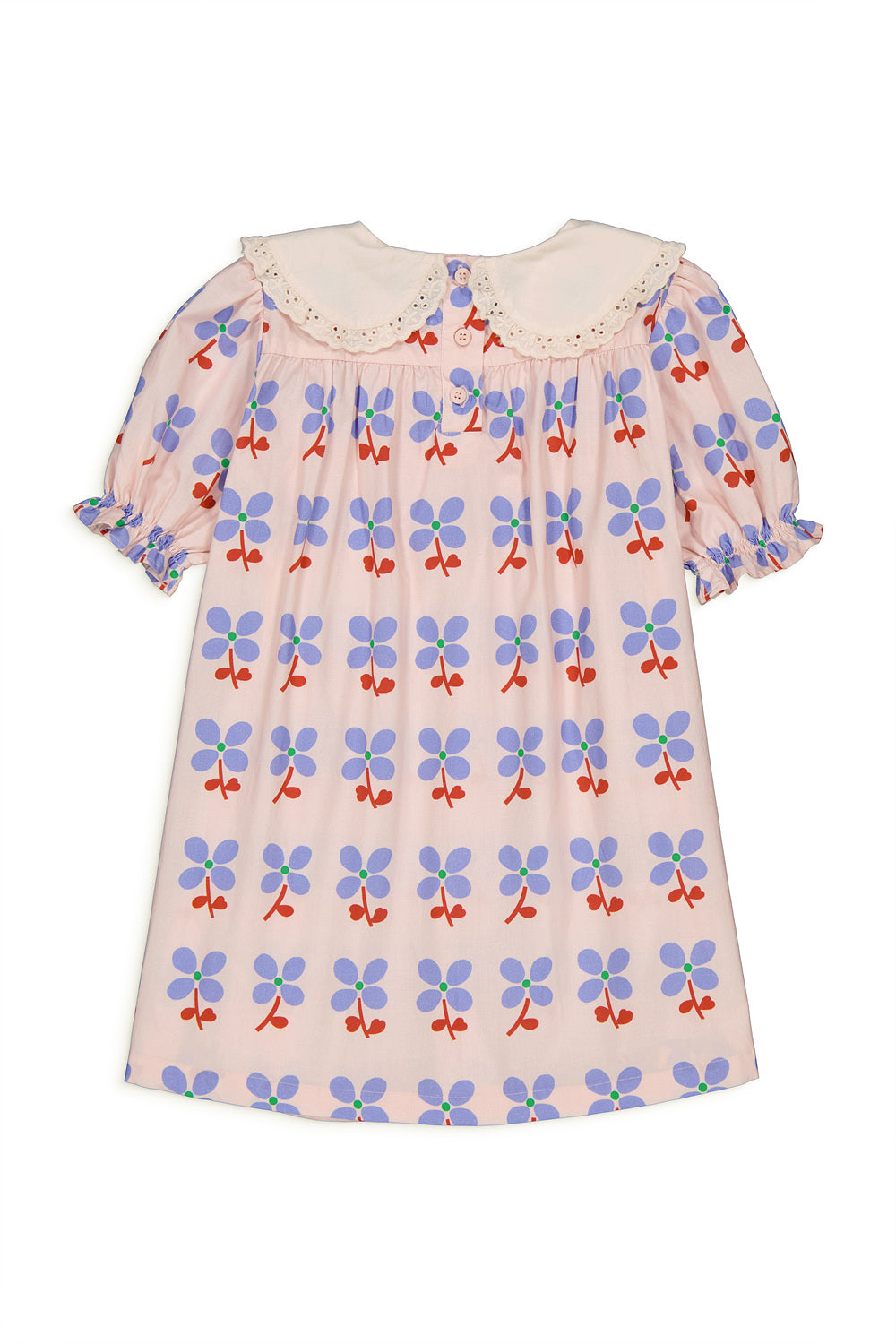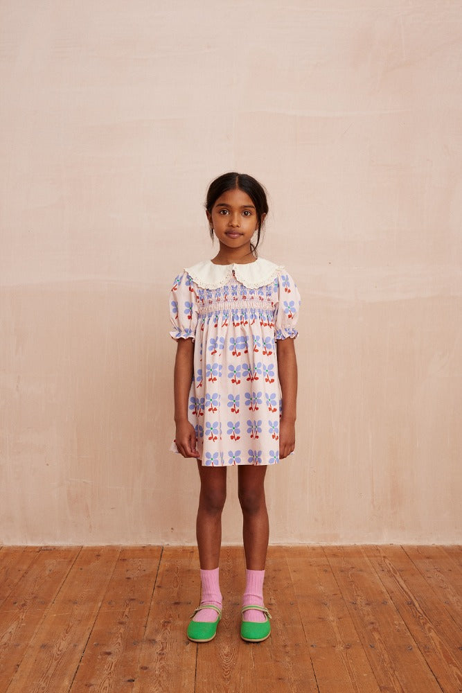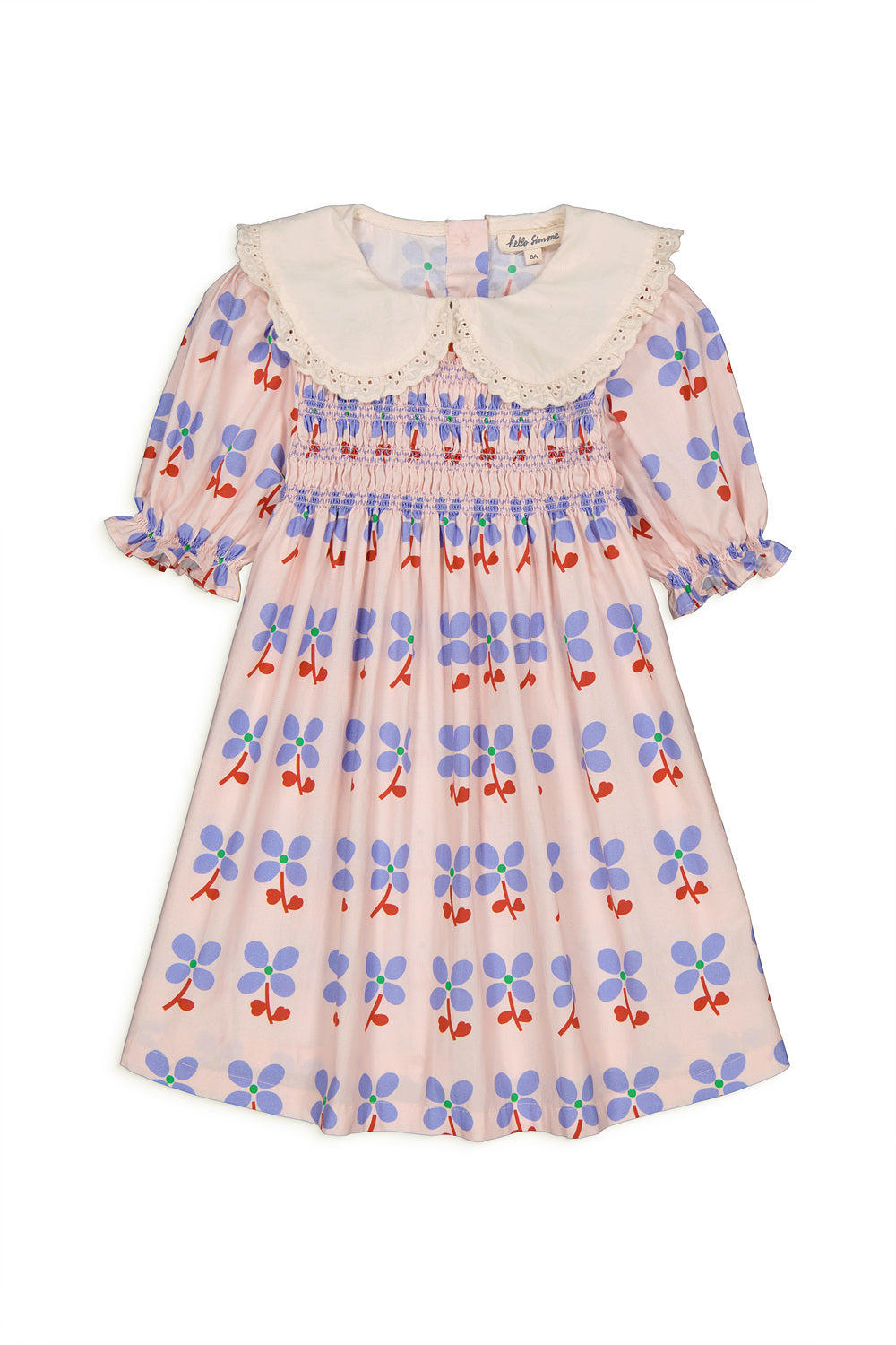 소재: 100% 코튼 (Oeko-Tex 인증)전체 프린트가 더해진 포플린 숏 드레스, 화려한 자수 장식이 더해진 스모크 디테일이 특징입니다. 큰 에크루 칼라는 브랜드 영문 자수로 장식되었으며, 팔꿈치 위로 프릴이 더해진 스모크 처리된 소매가 특징입니다. 뒷면 버튼 여밈. Made in India.제품 내 케어라벨 참고 : 기계 세탁 시 찬물 사용, 건조기 사용 금지