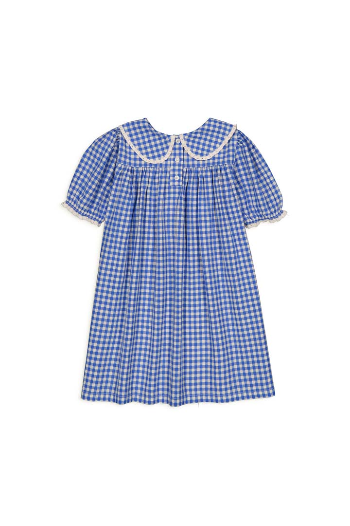 소재: 100% 코튼비시 체크 패턴의 숏 드레스, 화려한 자수 장식이 더해진 스모크 디테일이 특징입니다. 큰 칼라는 브랜드 영문 자수로 마감되었으며, 팔꿈치 위로 프릴이 더해진 스모크 처리된 소매가 특징입니다. 뒷면 버튼 여밈. Made in India.* 제품 내 케어라벨 참고 : 기계 세탁 시 찬물 사용, 건조기 사용 금지