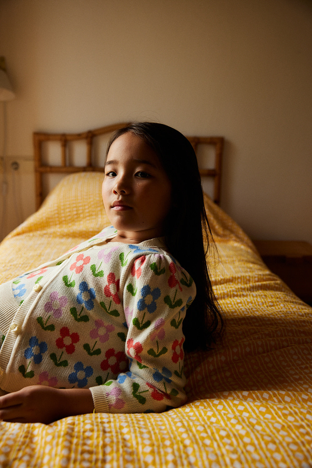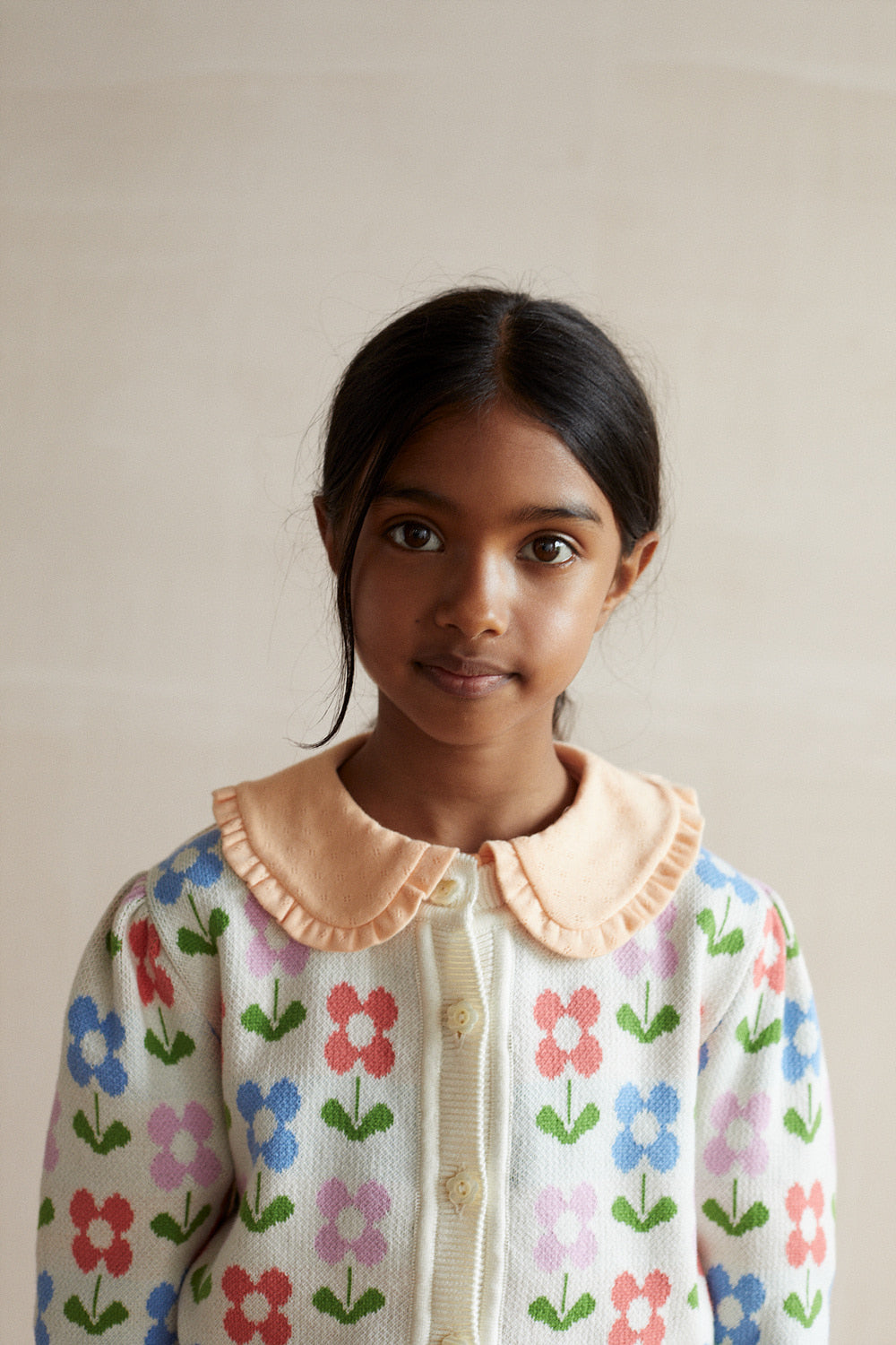 소재: 100% 코튼플로럴 자카드 니트 카디건으로, 에크루 색상의 RIB 디테일이 특징입니다. 긴 소매는 주름 디테일이 있으며, 꽃 모양의 버튼이 포인트를 줍니다. Made in Portugal.* 제품 내 케어라벨 참고 : 기계 세탁 시 찬물 사용, 건조기 사용 금지