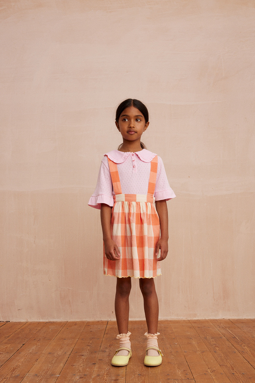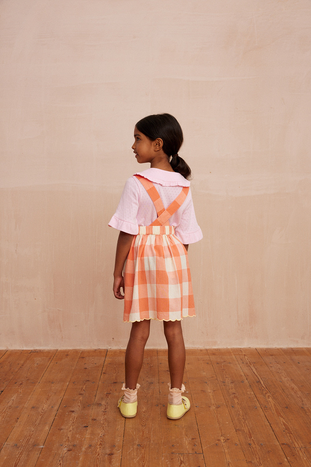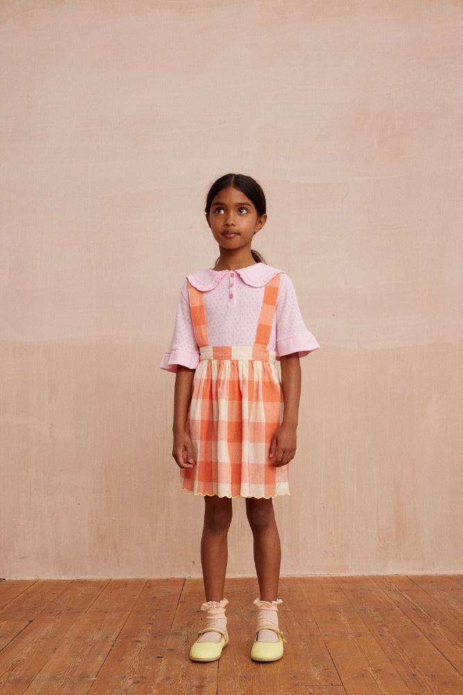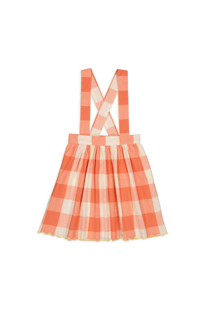 소재: 100% 코튼조절 가능한 스트랩과 사이드 포켓이 있는 체크 스커트입니다. 신축성 있는 허리와 주름 디테일이 더해졌으며, 하단에는 대비되는 스칼럽 장식이 있습니다. Made in India.* 제품 내 케어라벨 참고 : 기계 세탁 시 찬물 사용, 건조기 사용 금지