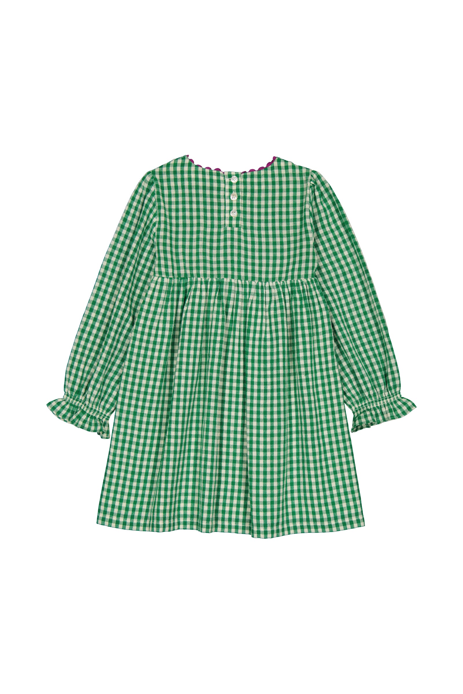 면 소재로 제작된 드레스입니다. 소매 끝부분에 러플 장식이 있고, 스모킹 디테일이 추가된 디자인입니다. Made in India.