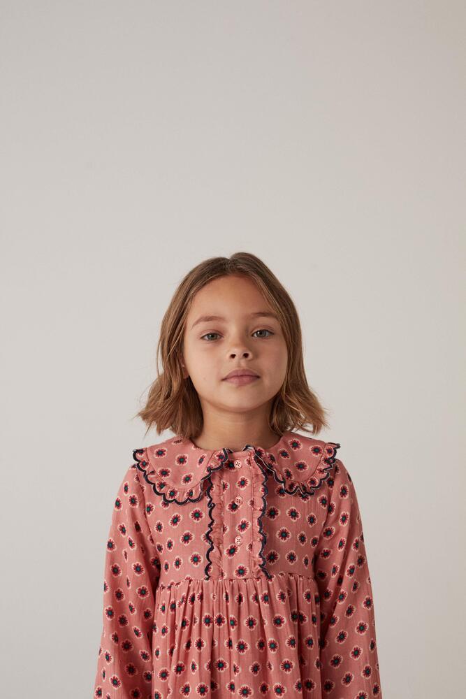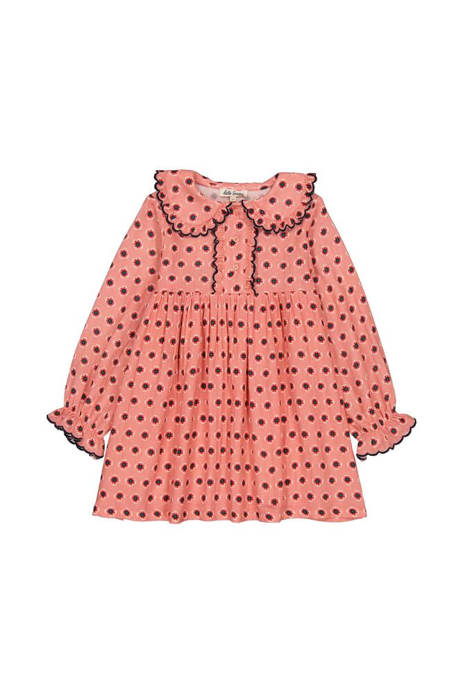 면 소재로 제작된 드레스입니다. 카라 부분에 물결 모양의 테두리가 있고, 카라는 드레스와 대비되는 색상으로 디자인되었습니다. Made in India.