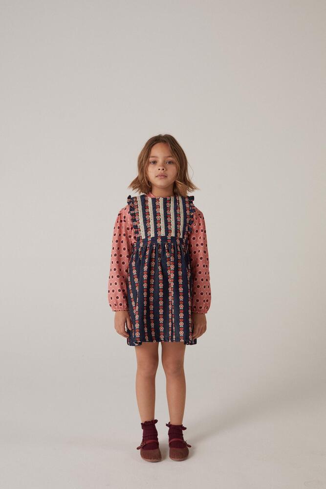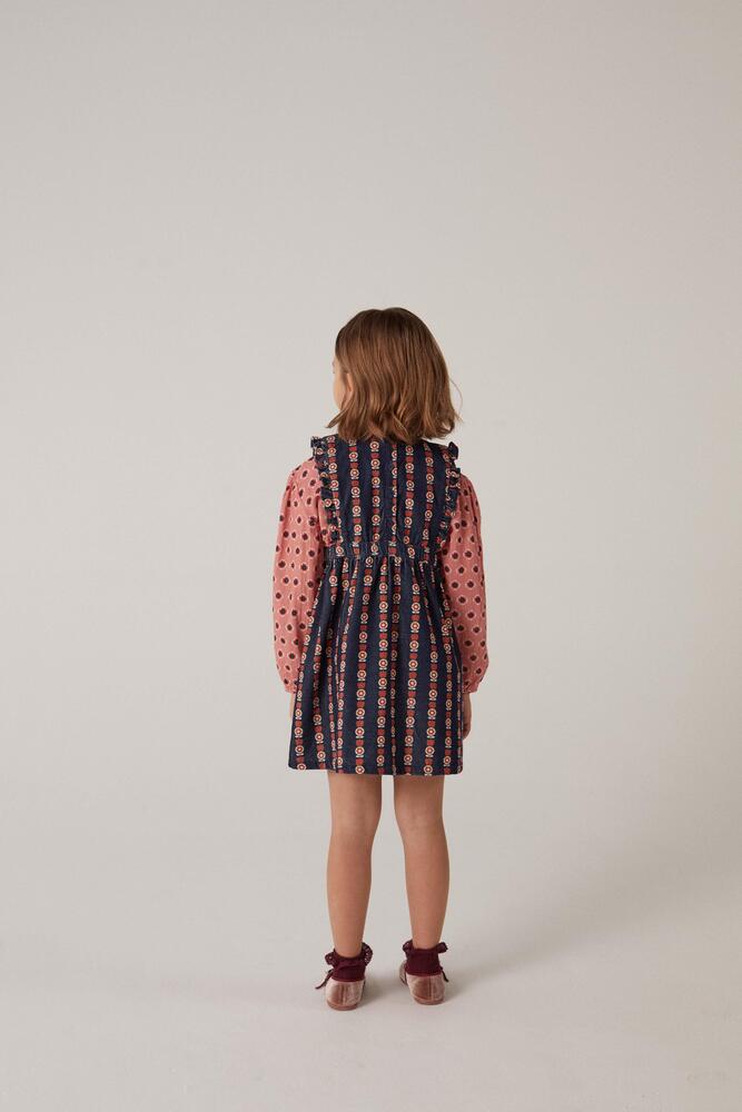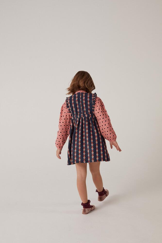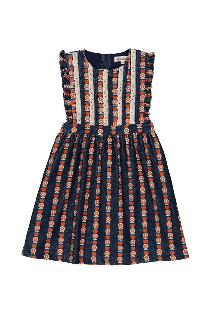 OEKO-TEX STANDARD 인증을 받은 면으로 제작된 골덴 소재의 피나폴 드레스입니다. 앞면에 영문으로 된 자수가 특징입니다. Made in India.