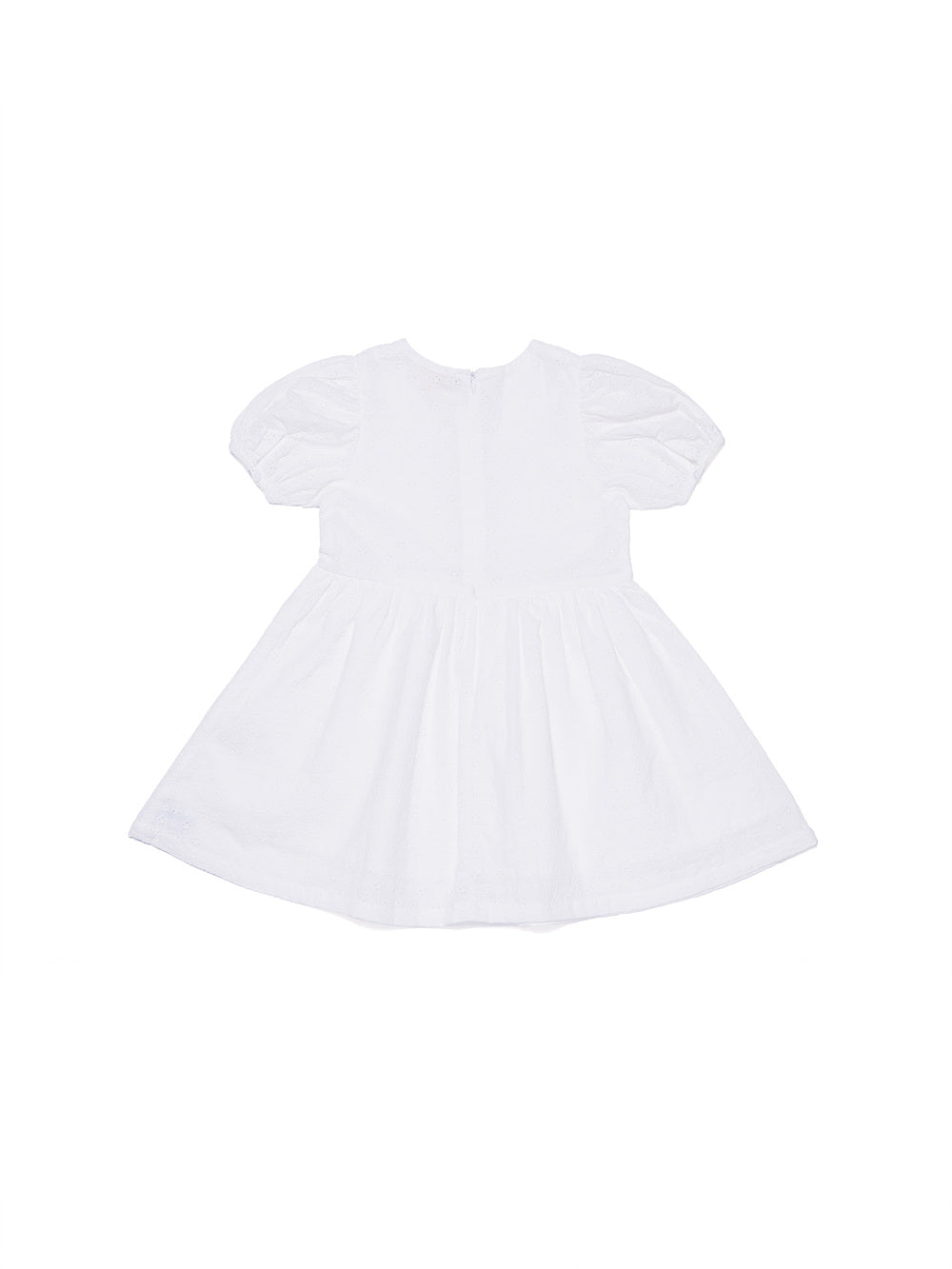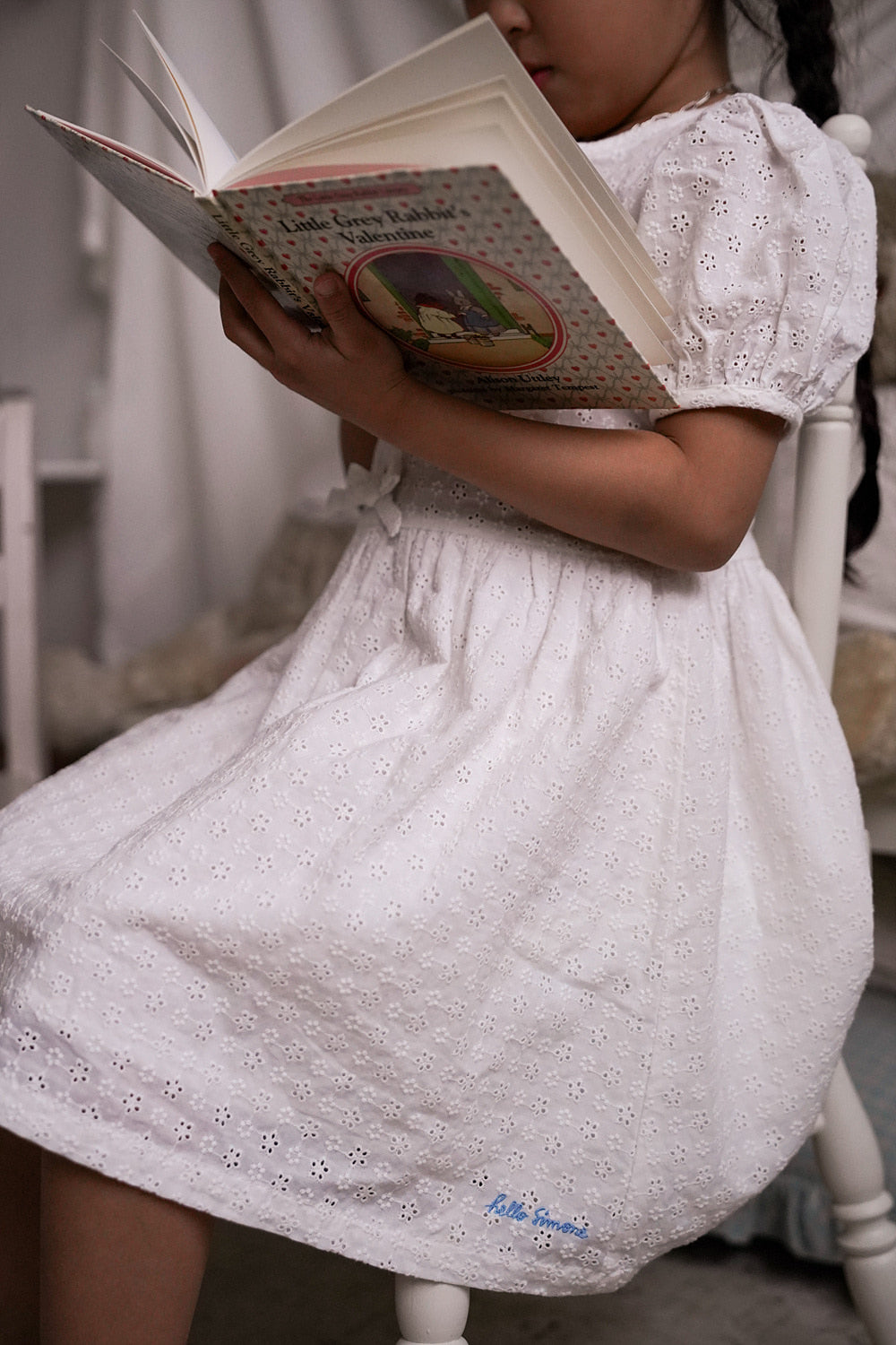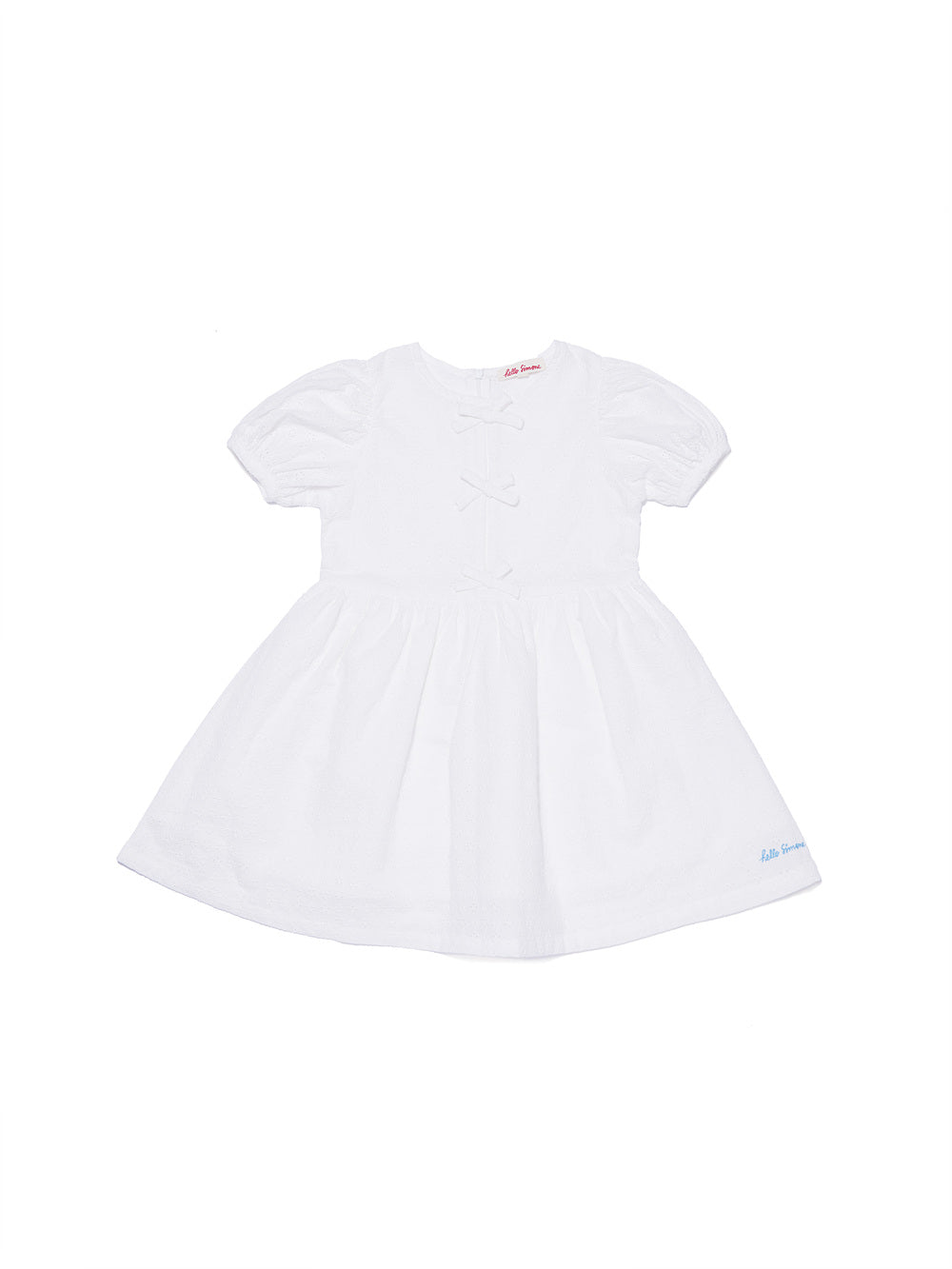 소재: 코튼 100%화이트 아일엣 소재의 리본 디테일이 포인트인 퍼프형 소매의 드레스입니다. Made in China.제품 내 케어라벨 참고 : 기계 세탁 시 찬물 사용, 건조기 사용 금지