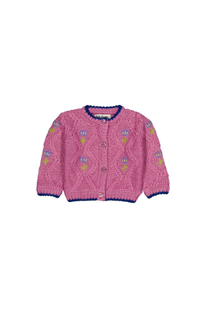 소재: 울 15%, 나일론 10%, 아크릴 75%꽃 자수가 놓인 솔리드 컬러 케이블 니트 베이비 가디건입니다.옆선에는 대비색 솔리드 디테일이 있으며, 앞면 버튼 여밈으로 마감되었습니다. Made in China.제품 내 케어라벨 참고 : 기계 세탁 시 찬물 사용, 건조기 사용 금지