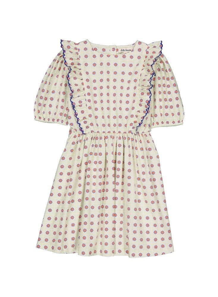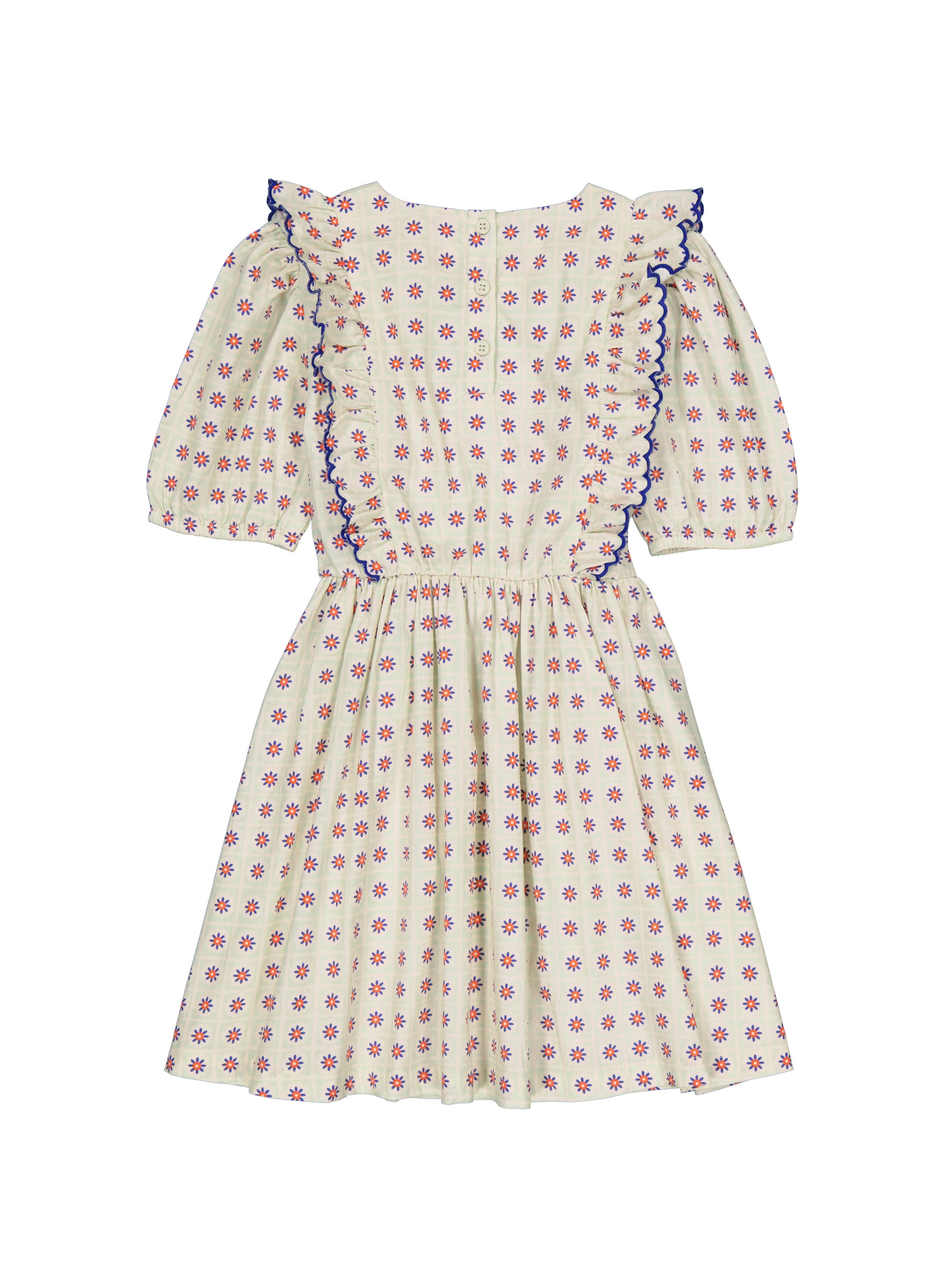 100% 면. 허리 밴드와 앞면에 프릴, 디테일이 추가된 드레스입니다. Made in India.