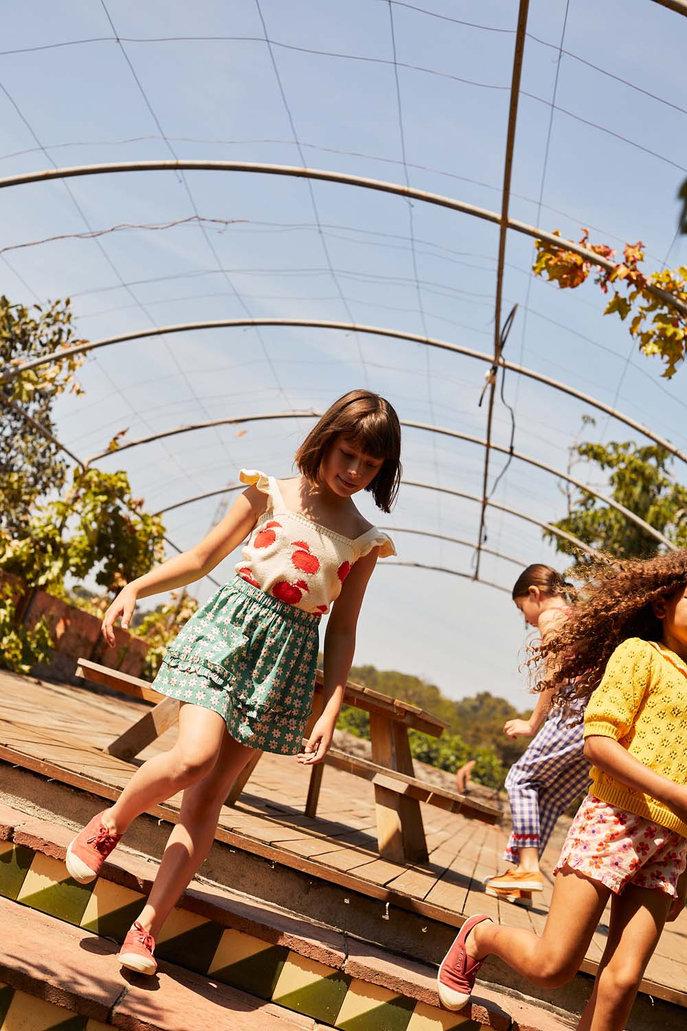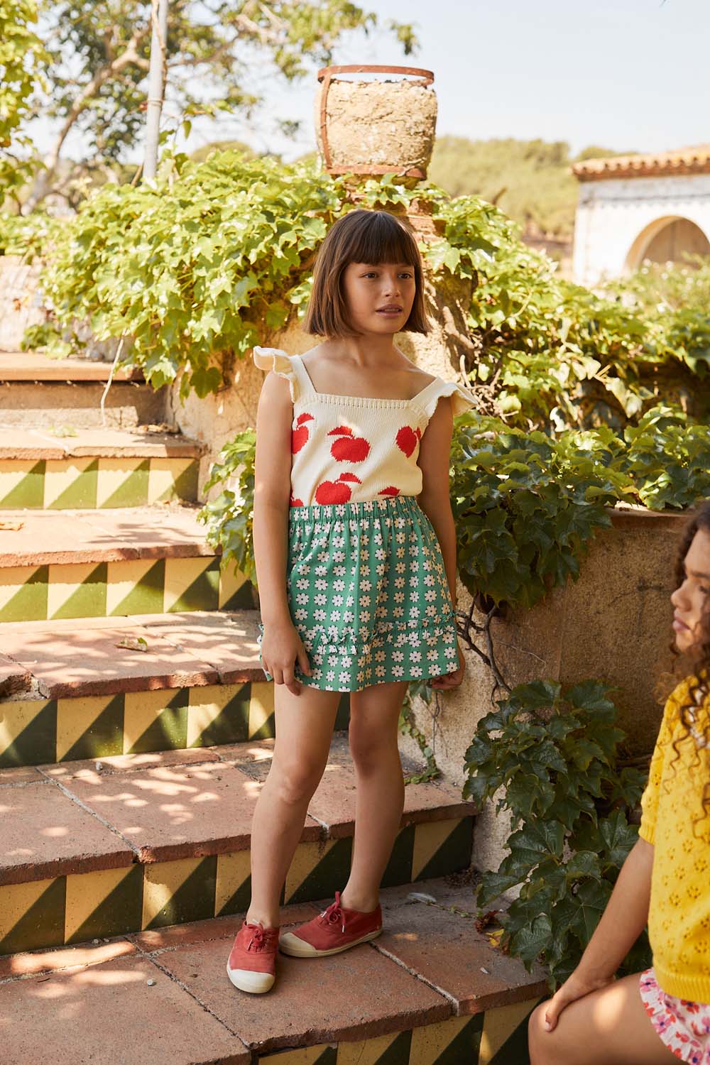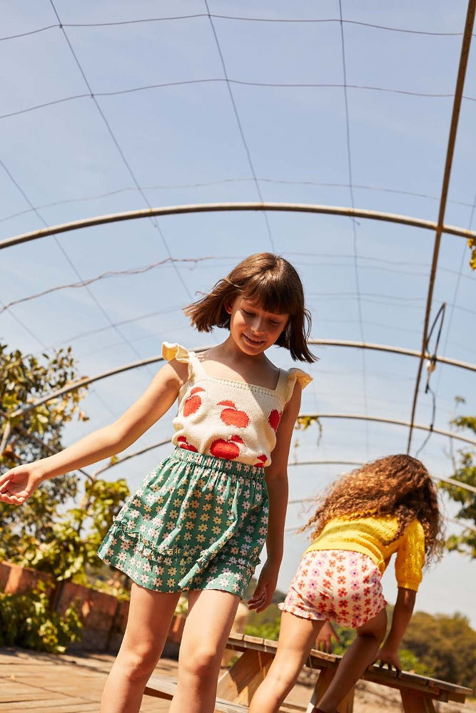 100% 면. 허리 밴드, 프릴이 달린 숏 스커트입니다. Made in India.